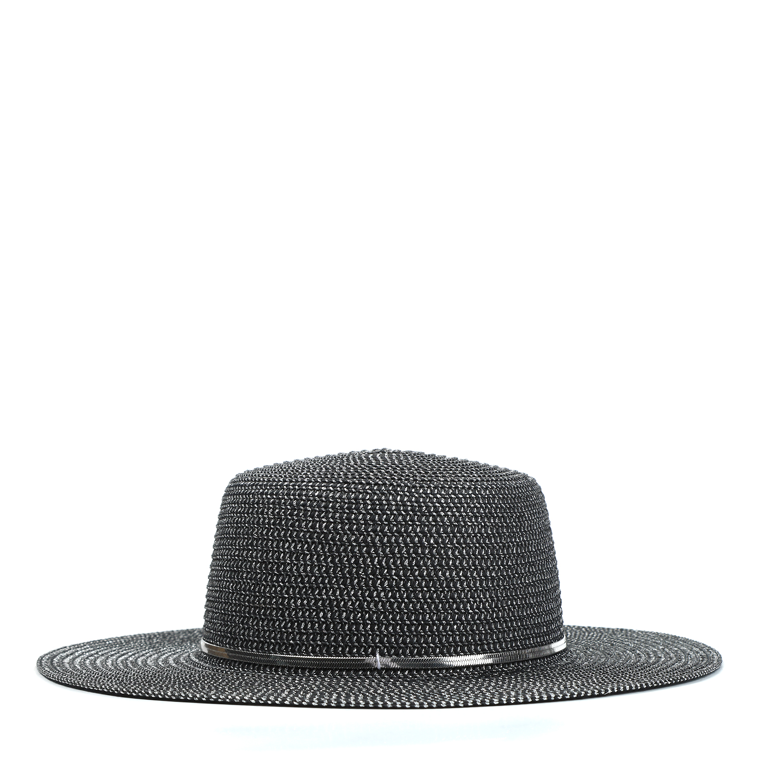 Необычная женская шляпа итальянского бренда FABRETTI в черном цвете. Эта шляпа-флоппи буквально сияет на солнце благодаря добавлению к соломке из целлюлозы блестящих люрексовых нитей.  У шляпы поля средней длины, тулья украшена плоской съемной металлической цепочкой. Внутри размер шляпы регулируется лентой.