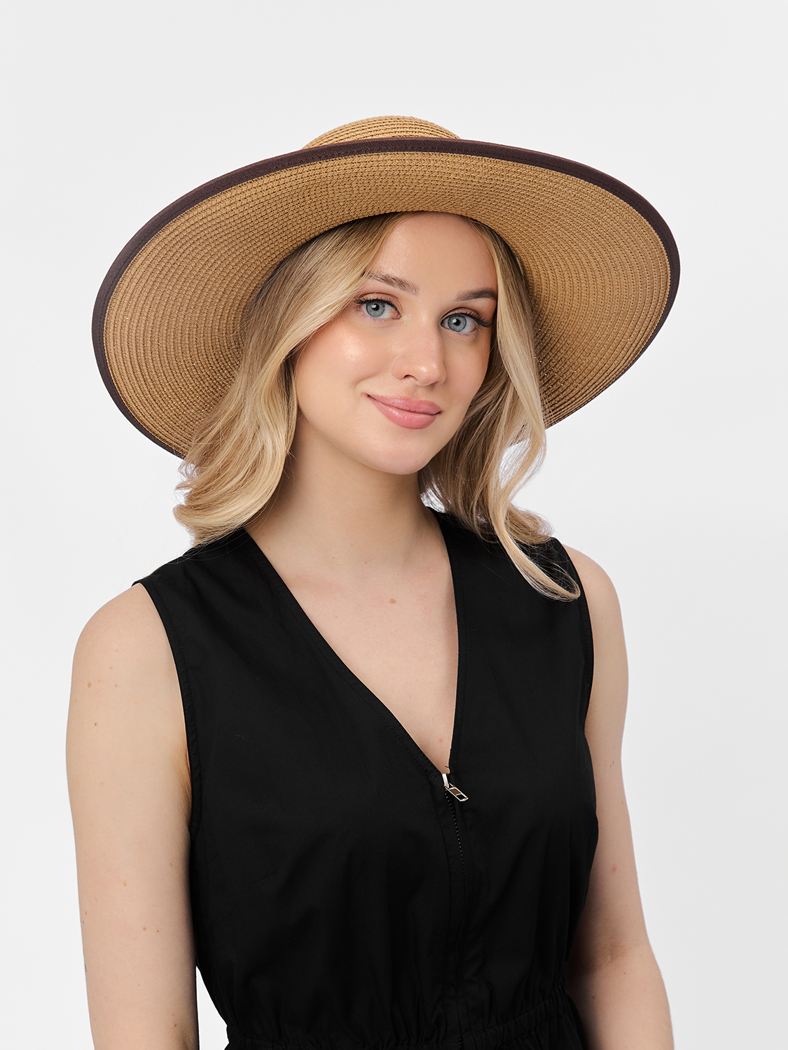 Шляпа флоппи с широкими прямыми полями прекрасно защищает от солнца, создавая на лице интригующую полутень. Двойной коричневый ремешок из экокожи на тулье и текстильный кант на полях в том же тоне структурируют силуэт шляпы, делая его более четким и позволяют сочетать шляпу с одеждой более темных тонов.
