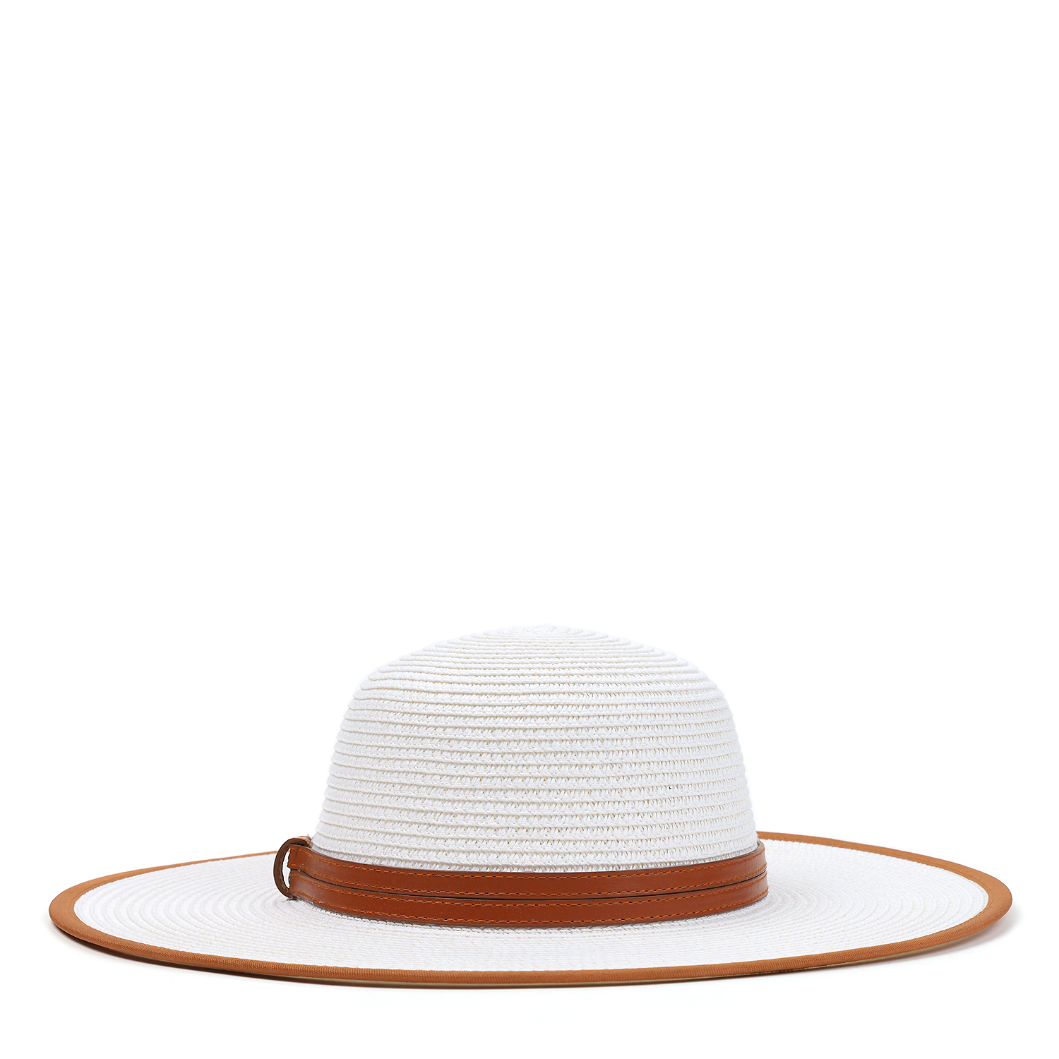 Шляпа флоппи с широкими прямыми полями прекрасно защищает от солнца, создавая на лице интригующую полутень. Двойной коричневый ремешок из экокожи на тулье и текстильный кант на полях в том же тоне структурируют силуэт шляпы, делая его более четким и позволяют сочетать шляпу с одеждой более темных тонов.