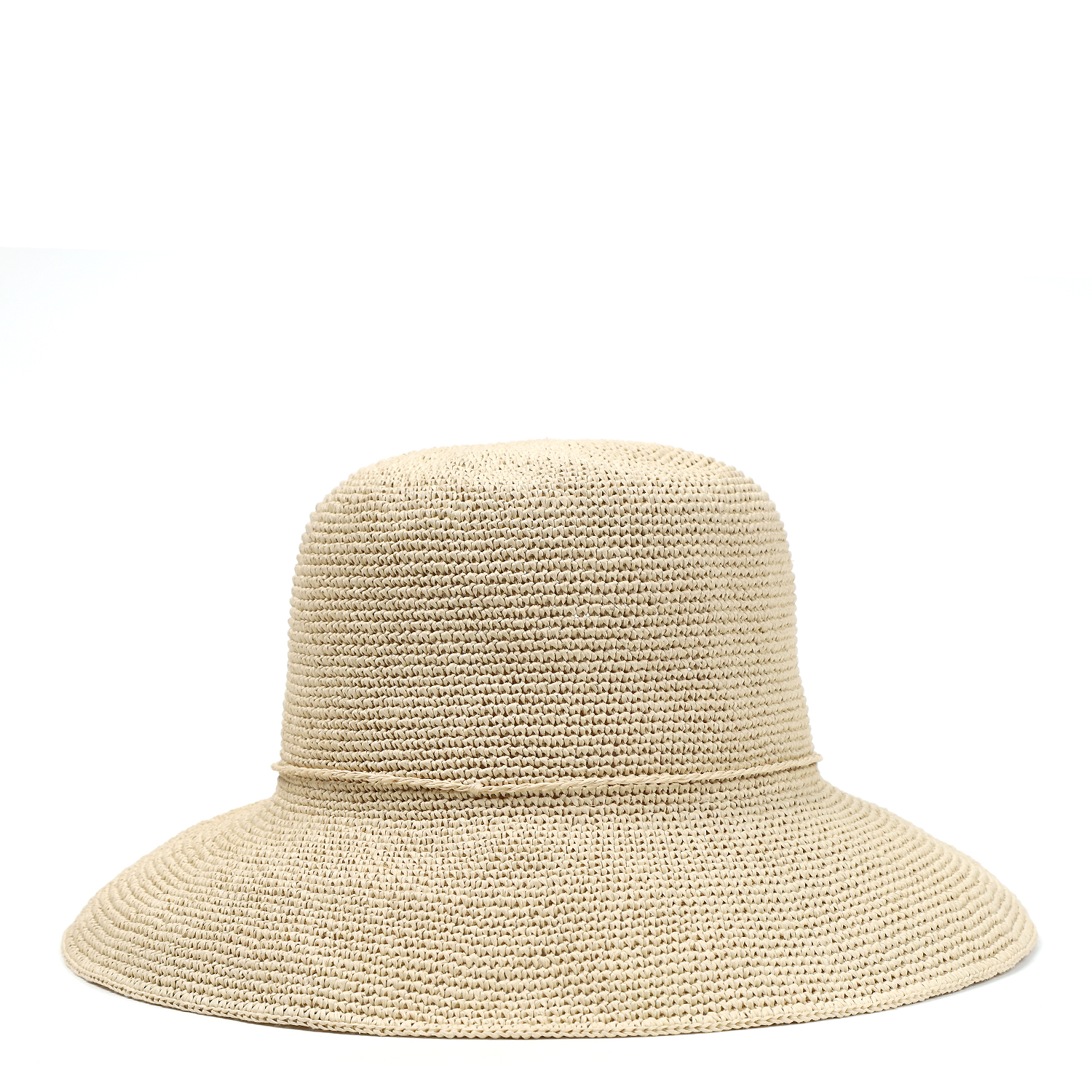 Необычная «вязаная» модель с мягкими опущенными полями. Поля по краю дополнены гибкой проволокой, позволяющей придать им желаемую форму. Тулья украшена тонким плетеным шнуром, завязанным бантом. Внутри объем панамы регулируется лентой.