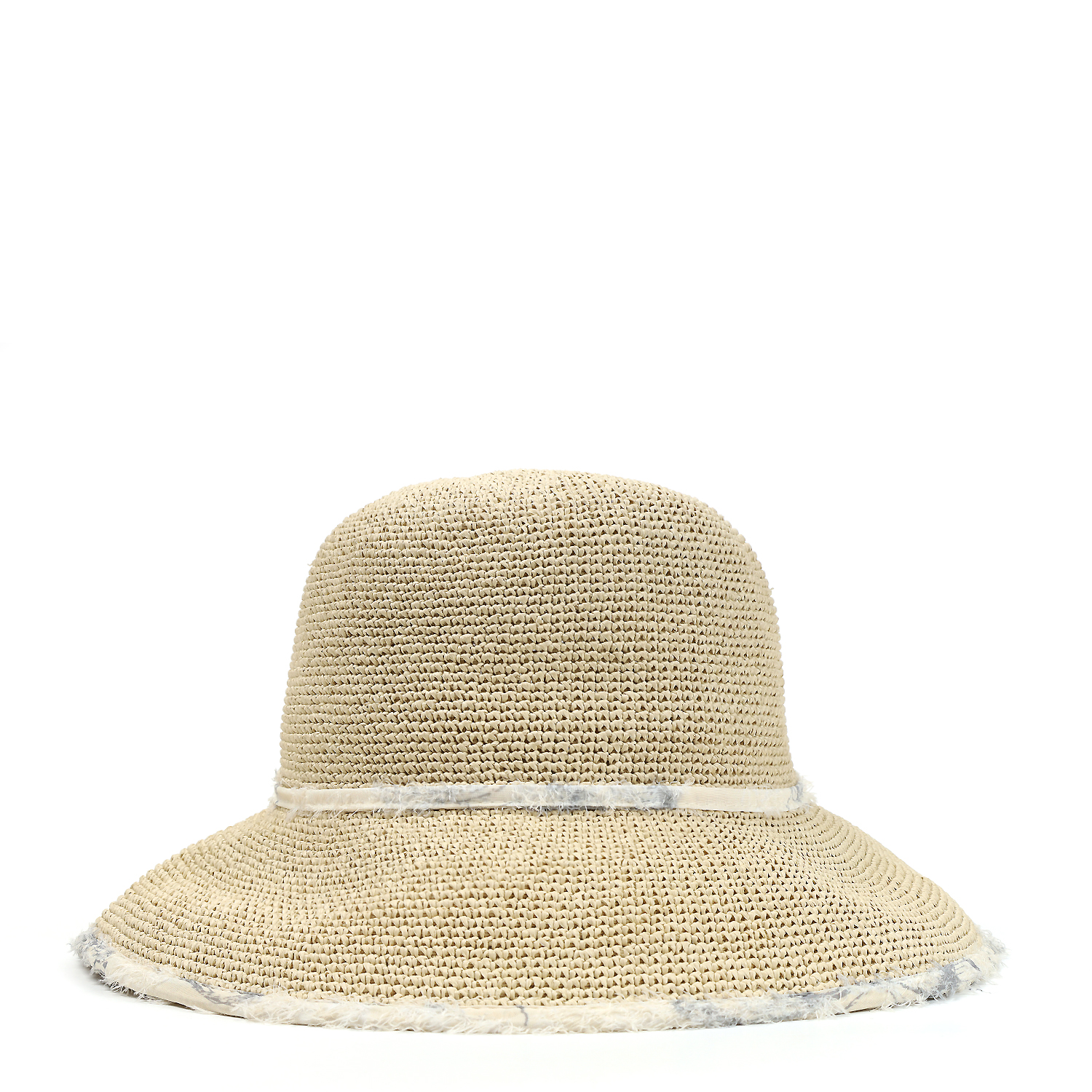 Легкая женская шляпа итальянского бренда FABRETTI с необычной текстильной отделкой в бежевом цвете. Эта шляпа-абажур с опущенными полями выполнена из плетеного волокна целлюлозы. Поля дополнены текстильной подкладкой с узором в виде бабочек и «ресничками» - пушистым ворсом на узорах. Тулья украшена тонкой лентой из аналогичной ткани с бантом. Внутри размер шляпы регулируется лентой.