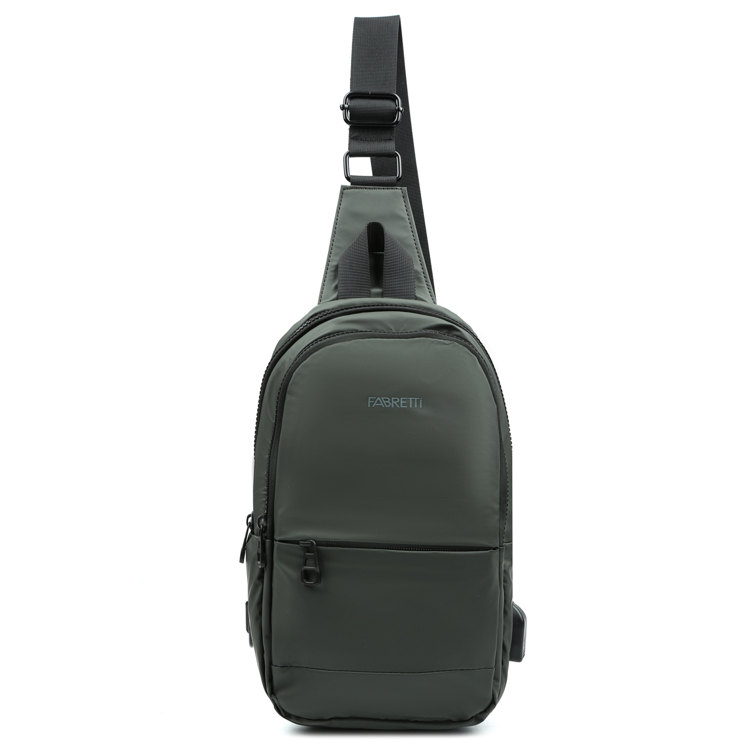 Сумка слинг FABRETTI в зеленом оттенке выполнена из влагостойкого гладкого нейлона. Основное отделение закрывается на полукруглую молнию. Внутри 3 открытых боковых кармана. Второе отделение также на полукруглой молнии. На лицевой стороне изделия расположен карман быстрого доступа.  Сбоку предусмотрен usb-порт. Спинка с системой циркуляции воздуха Air Flow имеет специальную рельефную поверхность, обеспечивает удобное прилегание к спине и вентиляцию. Сумку можно носить через плечо, а также на плече - переместив регулируемую по длине лямку. Аксессуар прекрасно подойдёт для прогулок по городу, велосипедных поездок или путешествий. Выполненный в стиле унисекс, подходит как мужчинам, так и женщинам.
