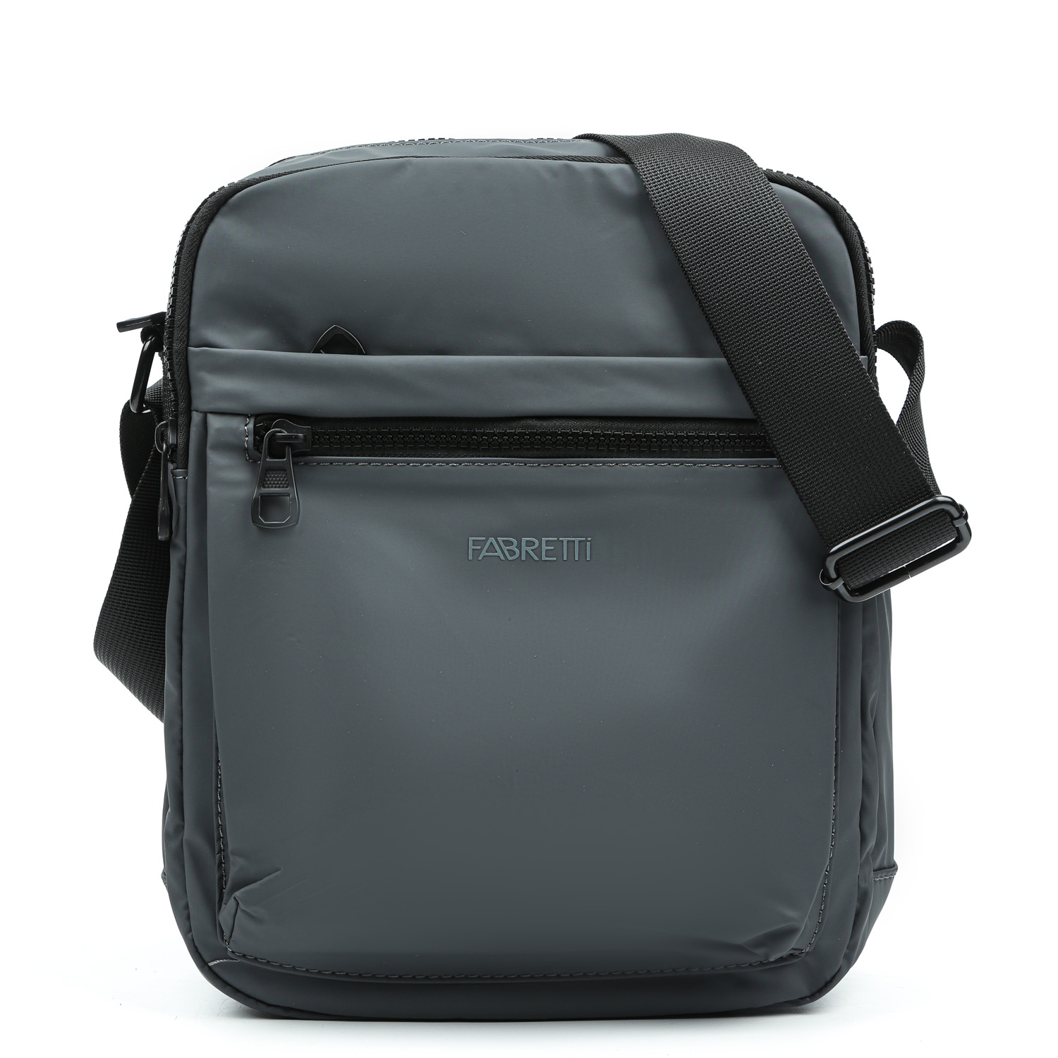 Сумка на плечо FABRETTI в сером оттенке выполнена из влагостойкого гладкого нейлона. Основное отделение закрывается на полукруглую молнию. Внутри 2 боковых кармана: открытый и на молнии. Второе отделение также на полукруглой молнии, внутри 2 открытых кармана для мелочей. На лицевой стороне изделия расположены 2 кармана быстрого доступа.  На тыльной стороне есть карман быстрого доступа на молнии. Плечевой ремень регулируется по длине, ширина - 4 см.