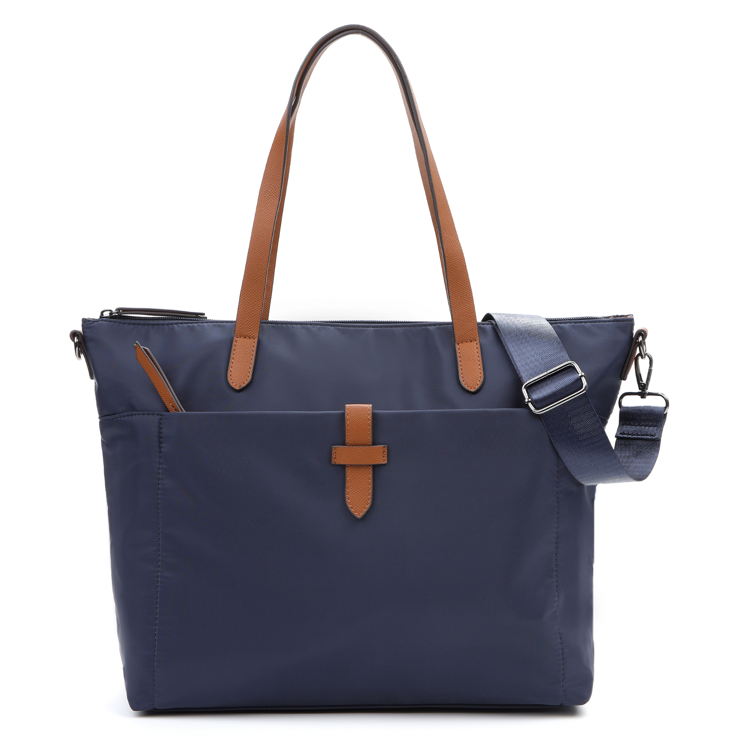Вместительная женская сумка-тоут из коллекции итальянского бренда FABRETTI в благородном синем оттенке.  Основное отделение закрывается на молнию. У сумки одно отделение с большим открытым карманом и мягким карманом для планшета на липучке. На лицевой стороне вместительный карман на молнии, украшенный ремешком из экокожи. На тыльной стороне карман быстрого доступа на молнии. Сумка дополнена ручками из экокожи и съемным регулируемым текстильным ремнем на карабинах.