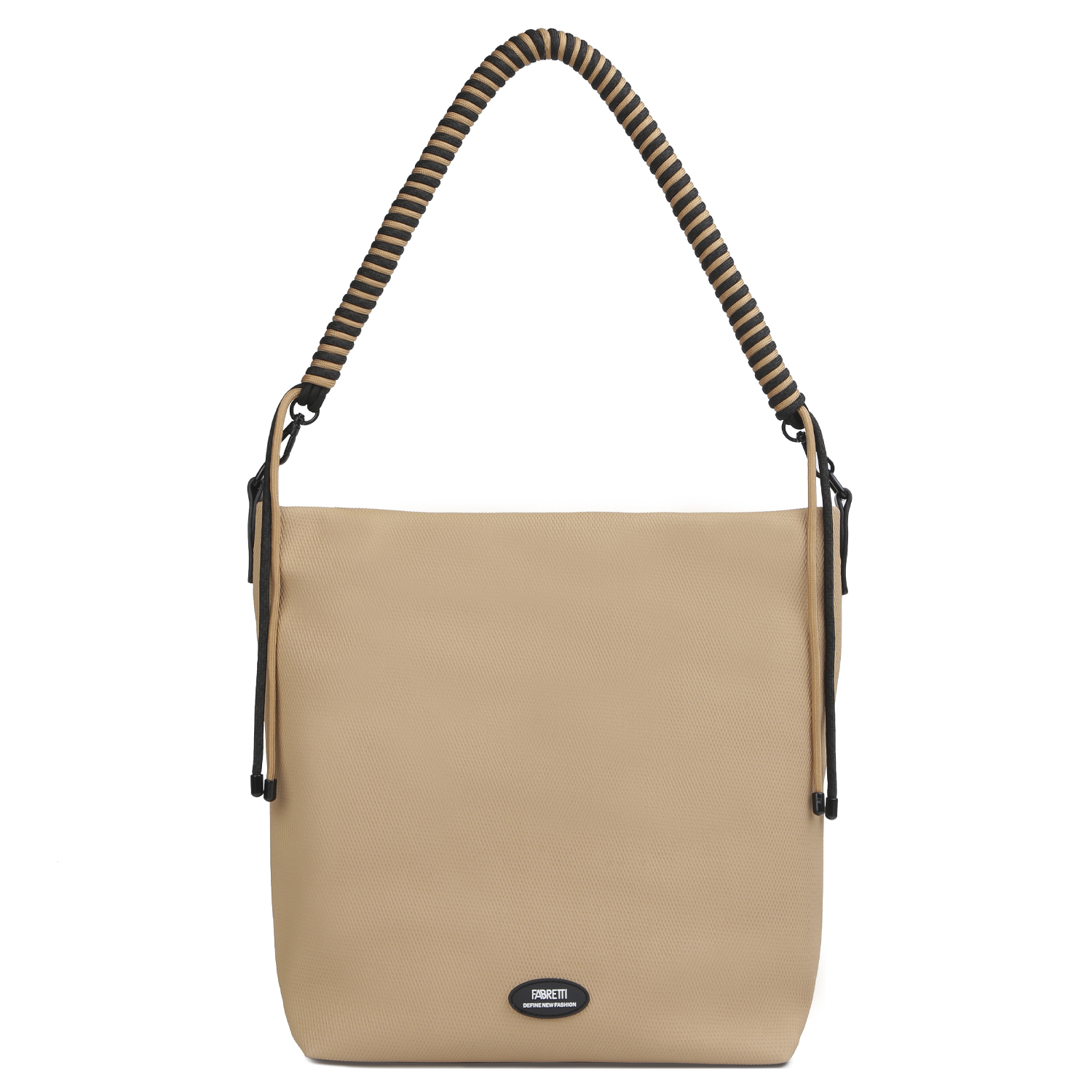 Текстильная сумка FABRETTI в бежевом оттенке выполнена из высокотехнологичного мягкого полиуретана с красивым матовым блеском и сетчатым тиснением. В основном отделении расположен один открытый карман и один на молнии. На тыльной стороне находится карман быстрого доступа. В комплекте идет текстильный плечевой ремень, который регулируется по длине. Сверху есть ручка с необычным дизайном в виде тугой переплетающейся спирали, чтобы носить аксессуар в руке.