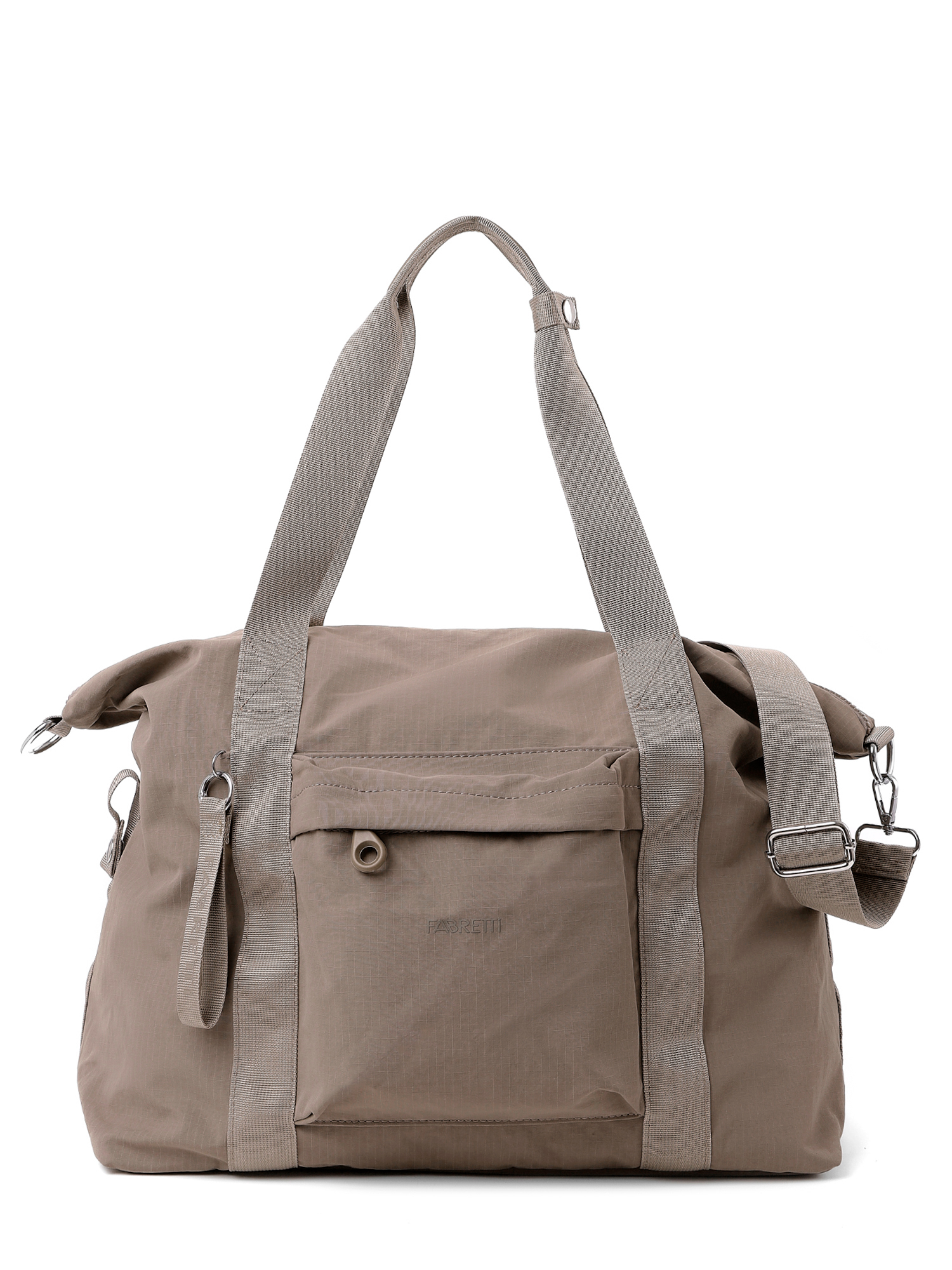 Модель оснащена широкими текстильными ручками с прорезиненными вставками и соединительным хлястиком с кнопкой. Для ношения на плече или кросс-боди есть съемный регулируемый плечевой ремень на карабинах.