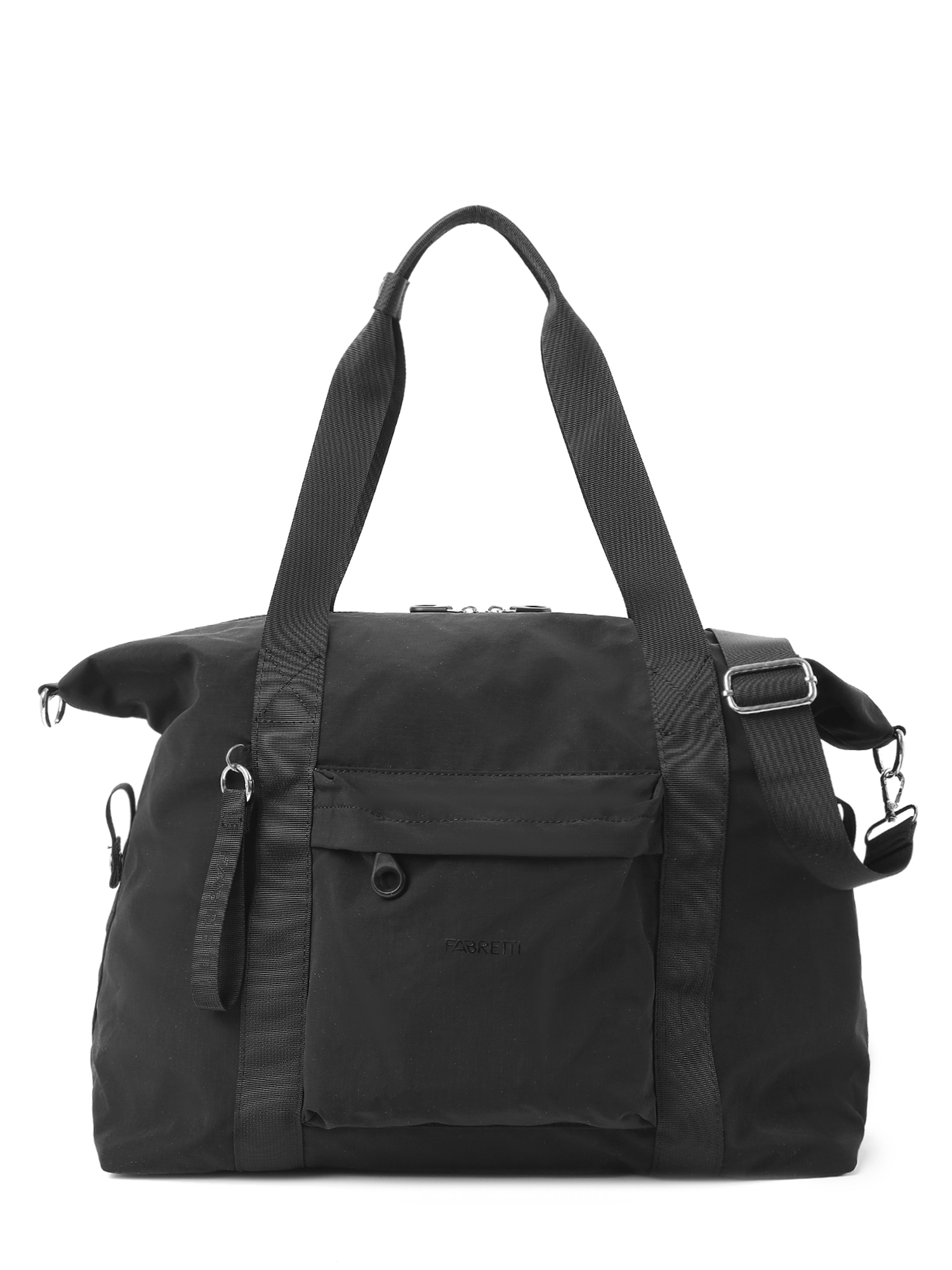 Вместительная дорожная сумка итальянского бренда FABRETTI это оптимальный аксессуар для поездки на несколько дней или в качестве дополнения к чемодану. Она выполнена из легкой ткани с характерной фактурой в клетку в черном цвете.