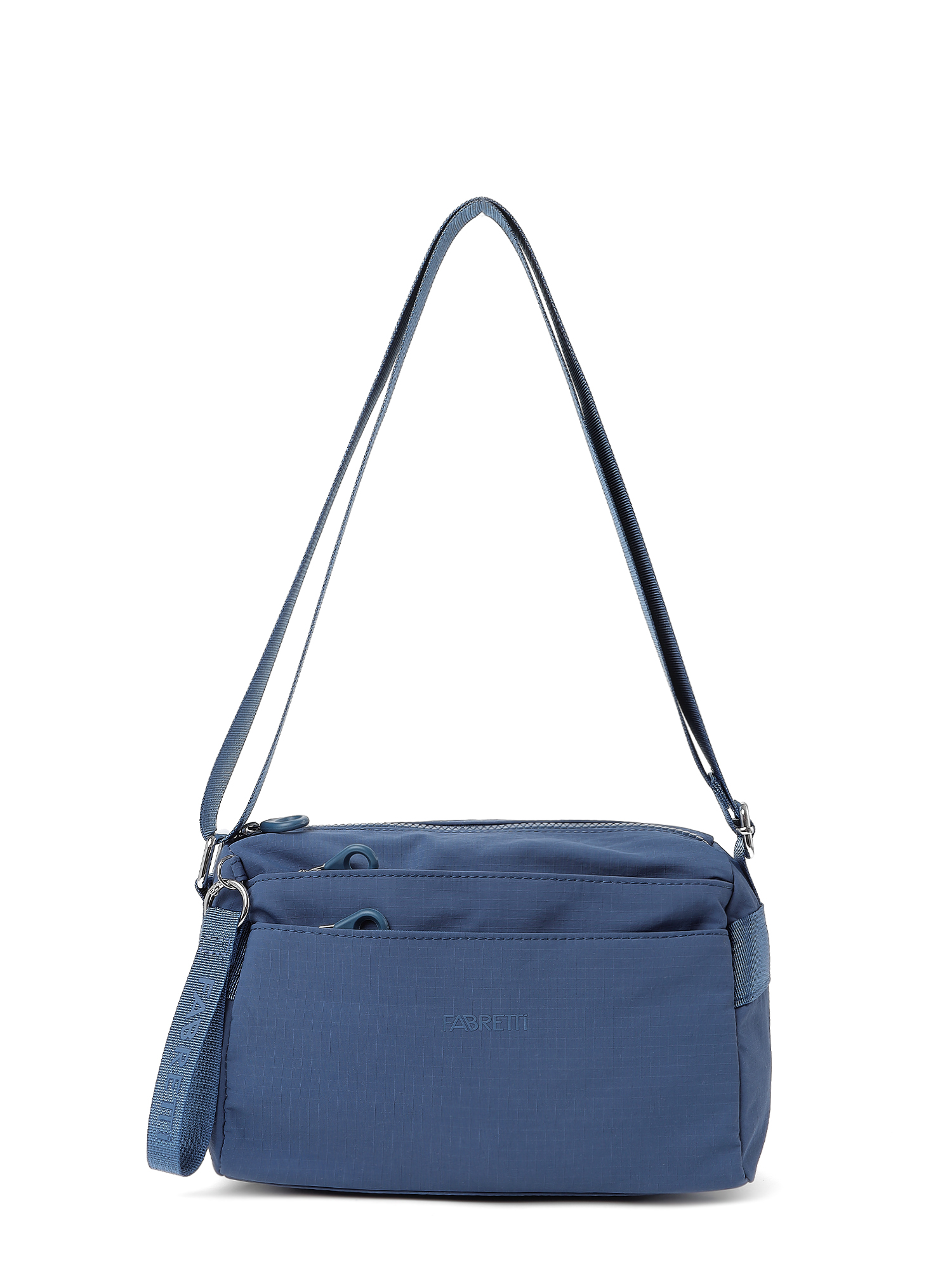 Небольшая вместительная текстильная женская сумка итальянского бренда FABRETTI отлично подходит для городского стиля и коротких поездок. Горизонтальная модель прямоугольной формы выполнена из легкой ткани с характерной фактурой в клетку в приглушенном светло-синем цвете.