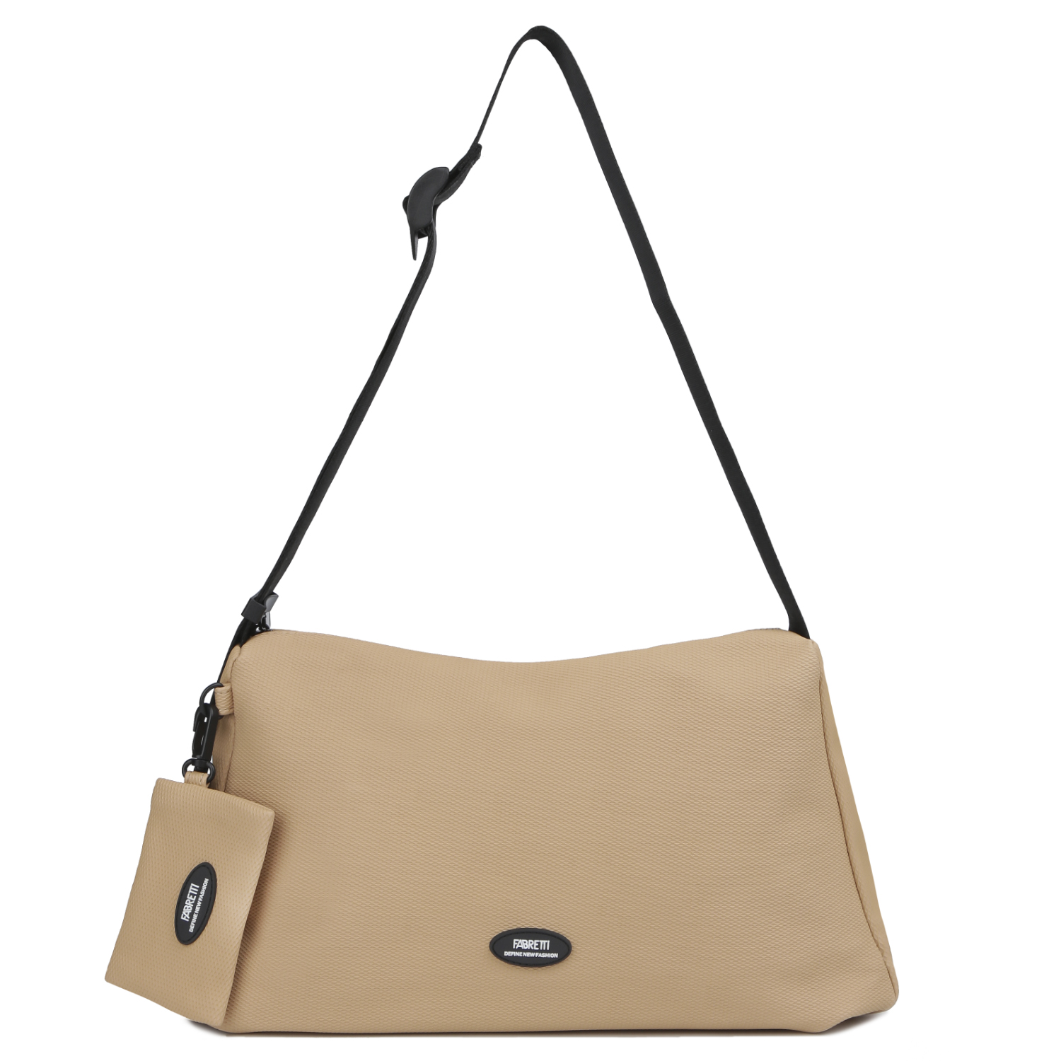Текстильная сумка FABRETTI в бежевом оттенке выполнена из высокотехнологичного мягкого полиуретана с красивым матовым блеском и сетчатым тиснением. В основном отделении расположены два открытых кармана и один на молнии. На тыльной стороне находится карман быстрого доступа. Текстильный плечевой ремень регулируется по длине. В комплекте с сумкой идет небольшой кармашек на молнии, который удобно крепится к сумке при помощи карабина.