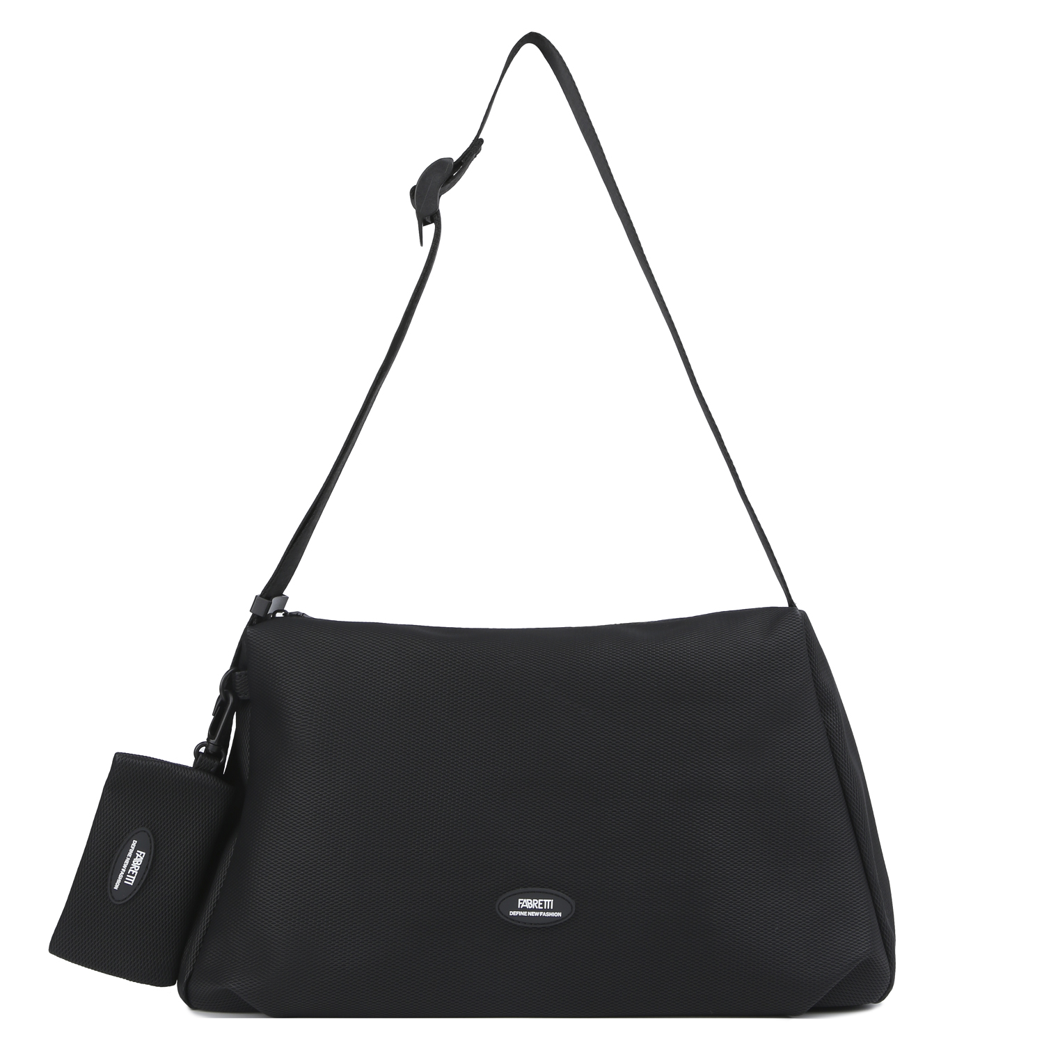 Текстильная сумка FABRETTI в черном оттенке выполнена из высокотехнологичного мягкого полиуретана с красивым матовым блеском и сетчатым тиснением. В основном отделении расположены два открытых кармана и один на молнии. На тыльной стороне находится карман быстрого доступа. Текстильный плечевой ремень регулируется по длине. В комплекте с сумкой идет небольшой кармашек на молнии, который удобно крепится к сумке при помощи карабина.