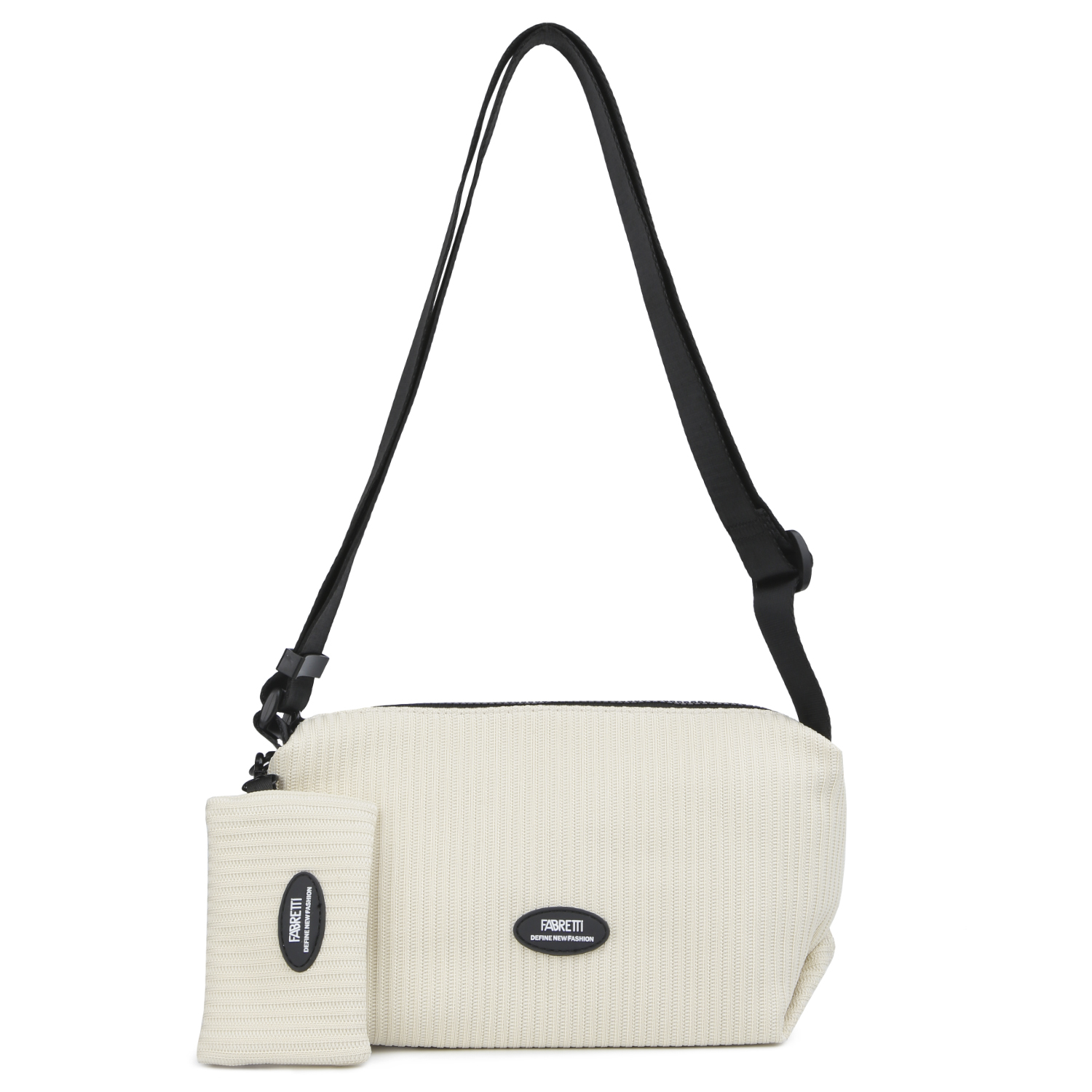 Текстильная сумка FABRETTI в бежевом оттенке выполнена из высокотехнологичного материала, который имитирует вязаный трикотаж. В основном отделении расположены два открытых кармана и один на молнии. На тыльной стороне находится карман быстрого доступа. Текстильный плечевой ремень регулируется по длине. В комплекте с сумкой идет небольшой кармашек на молнии, который удобно крепится к сумке при помощи карабина.