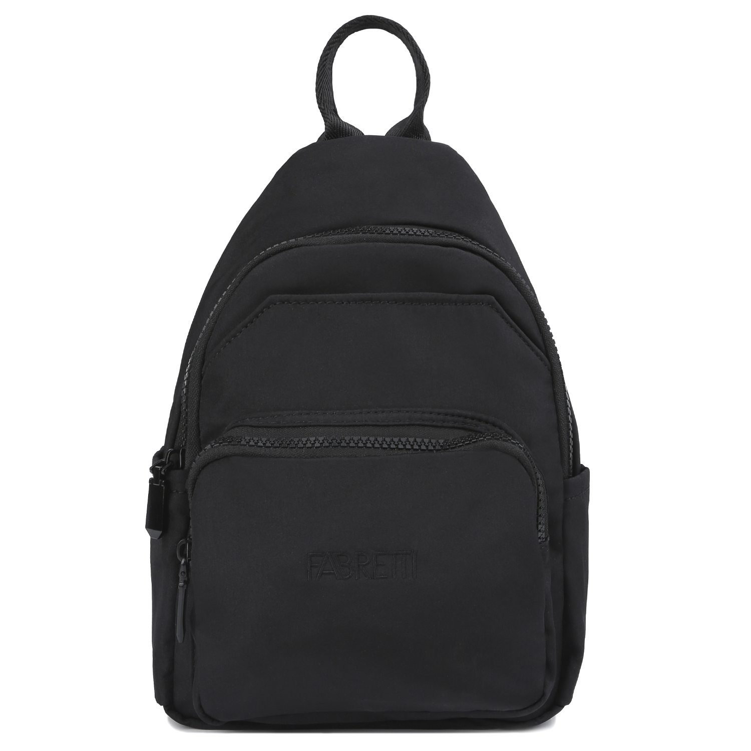 Текстильный рюкзак FABRETTI в черном оттенке выполнен из высокотехнологичного влагостойкого полиэстера. Он практичен и прост в уходе. Идеально подойдет для повседневного использования и учёбы, во время поездок и занятий спортом. Основное отделение закрывается на  молнию. Внутри есть 2 открытых кармана. На лицевой стороне расположен потайной карман на магнитной кнопке. Также впереди есть карман на молнии. На тыльной стороне рюкзака расположен карман быстрого доступа на молнии. По бокам есть 2 открытых кармана на резинке для бутылки с водой или зонта. Мягкие и плотные лямки легко регулируются по длине, а благодаря молнии могут трансформироваться в одну или две. Сверху есть ручка, чтобы носить аксессуар в руке.