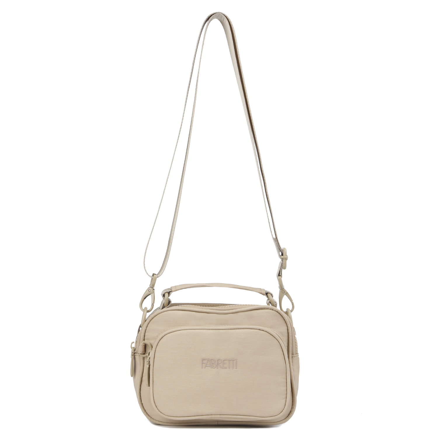 Текстильная сумка FABRETTI в бежевом оттенке выполнена из высокотехнологичного влагостойкого полиэстера. Модель имеет 2 отделения. В одном из них расположены 2 открытых кармана и 1 на молнии. На лицевой стороне находится 1 карман быстрого доступа и ещё один - на тыльной стороне. Текстильный плечевой ремень регулируется по длине. Сверху есть ручка, чтобы носить аксессуар в руке.