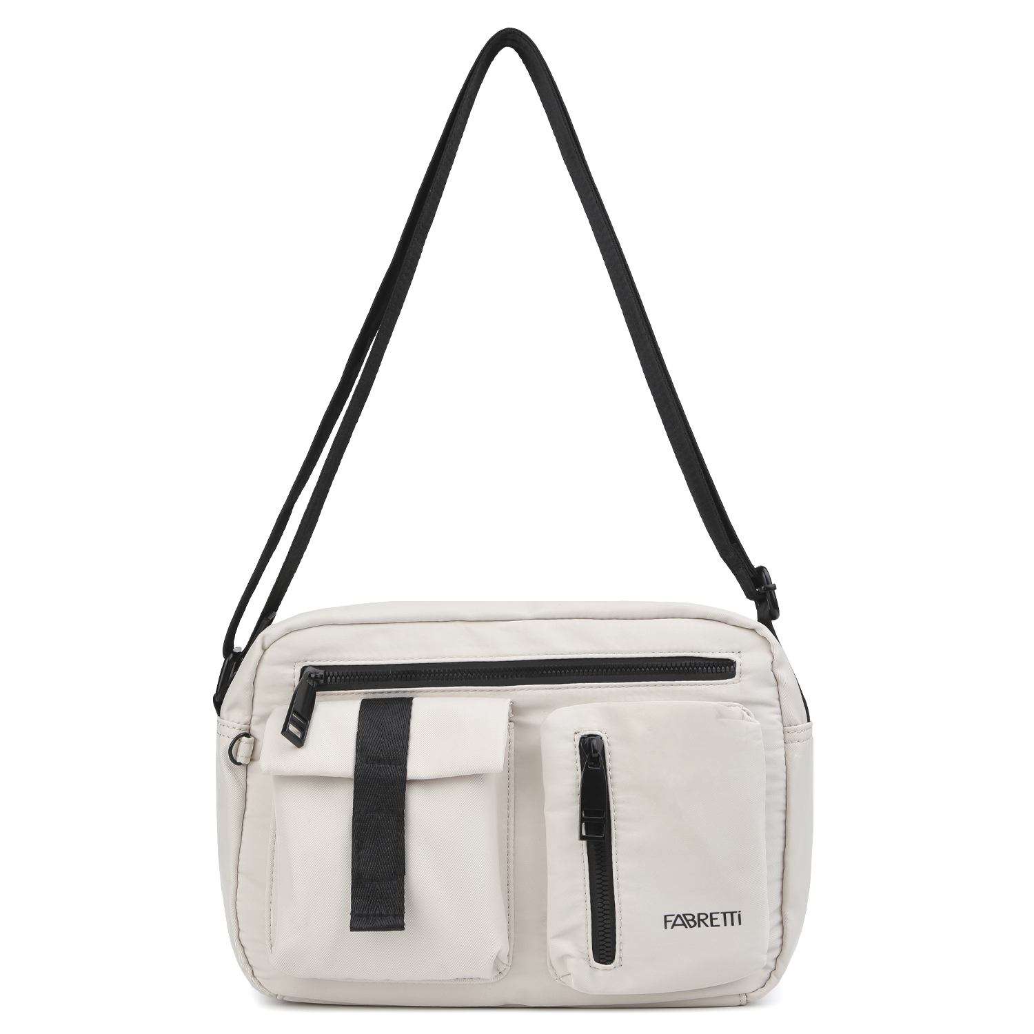Текстильная сумка FABRETTI в бежевом оттенке выполнена из высокотехнологичного влагостойкого полиэстера. В основном отделении расположены 2 открытых кармана и один на молнии. На лицевой стороне находится один карман быстрого доступа и ещё один - на тыльной стороне. Также спереди находятся два маленьких кармана для мелочей - на молнии и на липучке. Текстильный плечевой ремень регулируется по длине.