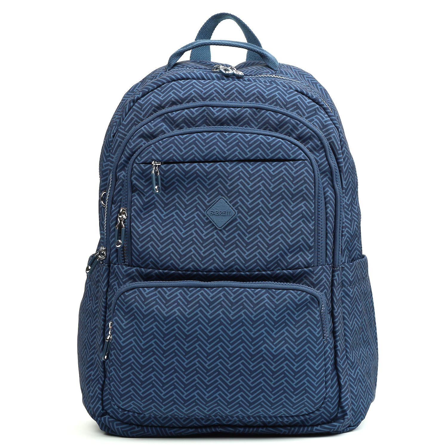 Вместительный текстильный рюкзак итальянского бренда FABRETTI в синем оттенке с геометрическими принтами выполнен из высокотехнологичного влагостойкого полиэстера. Основное отделение закрывается на молнию с двумя бегунками. Внутри есть секция для гаджетов, карман на молнии и два открытых кармана. На лицевой стороне расположены два дополнительных отделения на полукруглой молнии и карман быстрого доступа на молнии. Также имеются два открытых боковых кармана на резинке. И карман быстрого доступа на молнии на спинке.