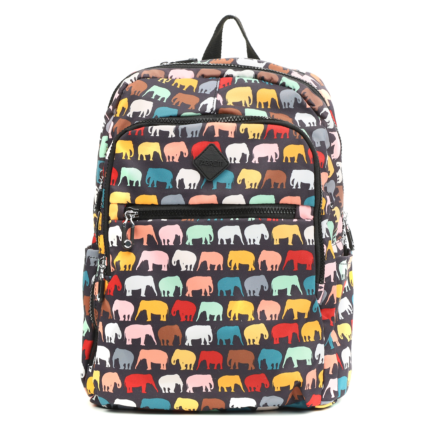 Текстильный рюкзак итальянского бренда FABRETTI в черном цвете с принтом в виде слонов с геометрическими принтами идеально подойдет тем, кто ведет активный образ жизни, учится и предпочитает путешествовать налегке. Он достаточно вместителен, чтобы в него вошла любимая книга, документы, гаджеты, необходимая одежда, гигиенические аксессуары. Материал рюкзака устойчив к влаге, за ним легко ухаживать.