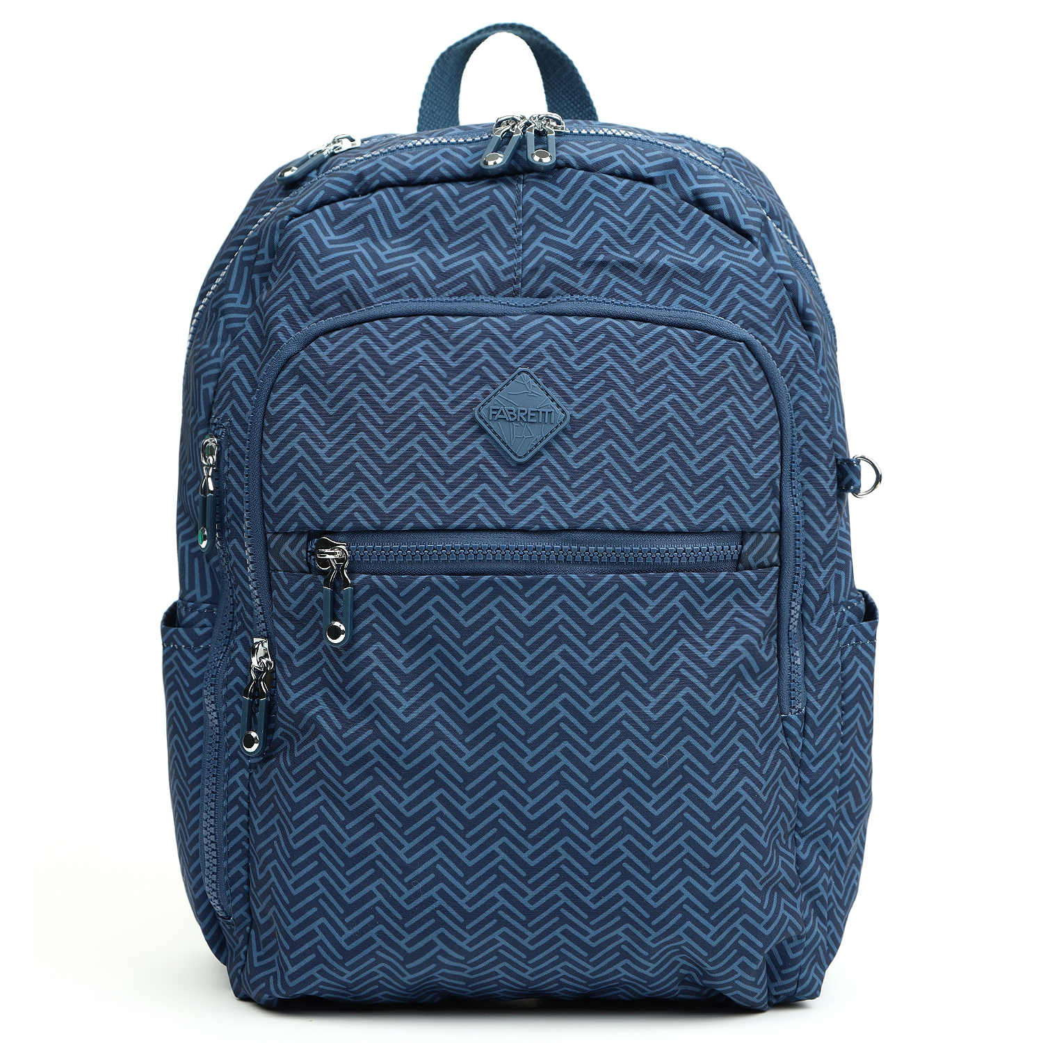 Текстильный рюкзак итальянского бренда FABRETTI в синем оттенке с геометрическими принтами идеально подойдет тем, кто ведет активный образ жизни, учится и предпочитает путешествовать налегке. Он достаточно вместителен, чтобы в него вошла любимая книга, документы, гаджеты, необходимая одежда, гигиенические аксессуары. Материал рюкзака устойчив к влаге, за ним легко ухаживать.