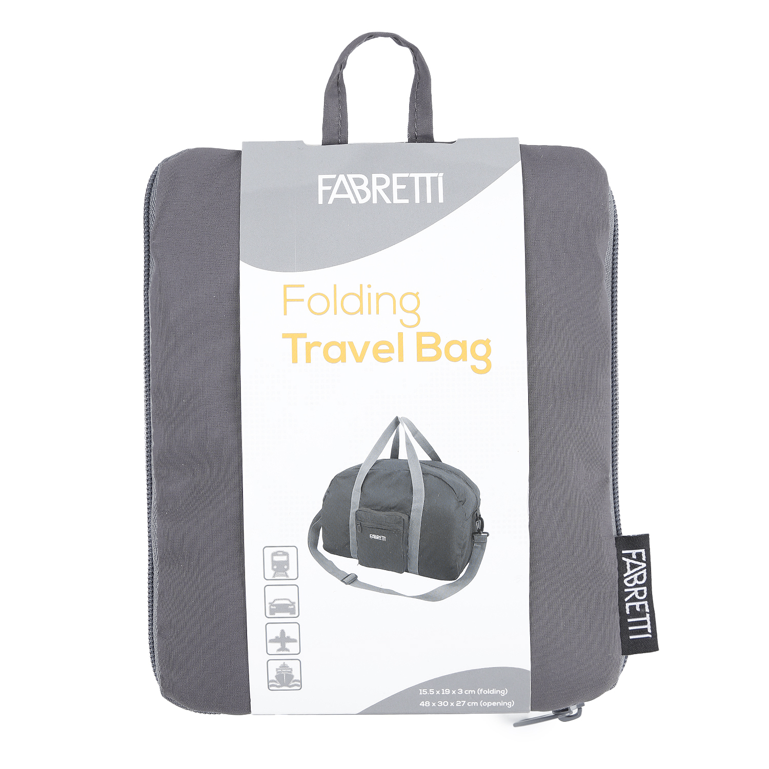 Складная дорожная сумка итальянского бренда FABRETTI серого цвета выполнена из технологичной синтетической ткани. Легкий и прочный материал позволяет упаковать вместительную сумку в маленький чехол на молнии, который практически не занимает места в багаже. Чехол на молнии имеет полное раскрытие, внутри небольшой карман на молнии; при раскрытии сумки он служит карманом на лицевой части.