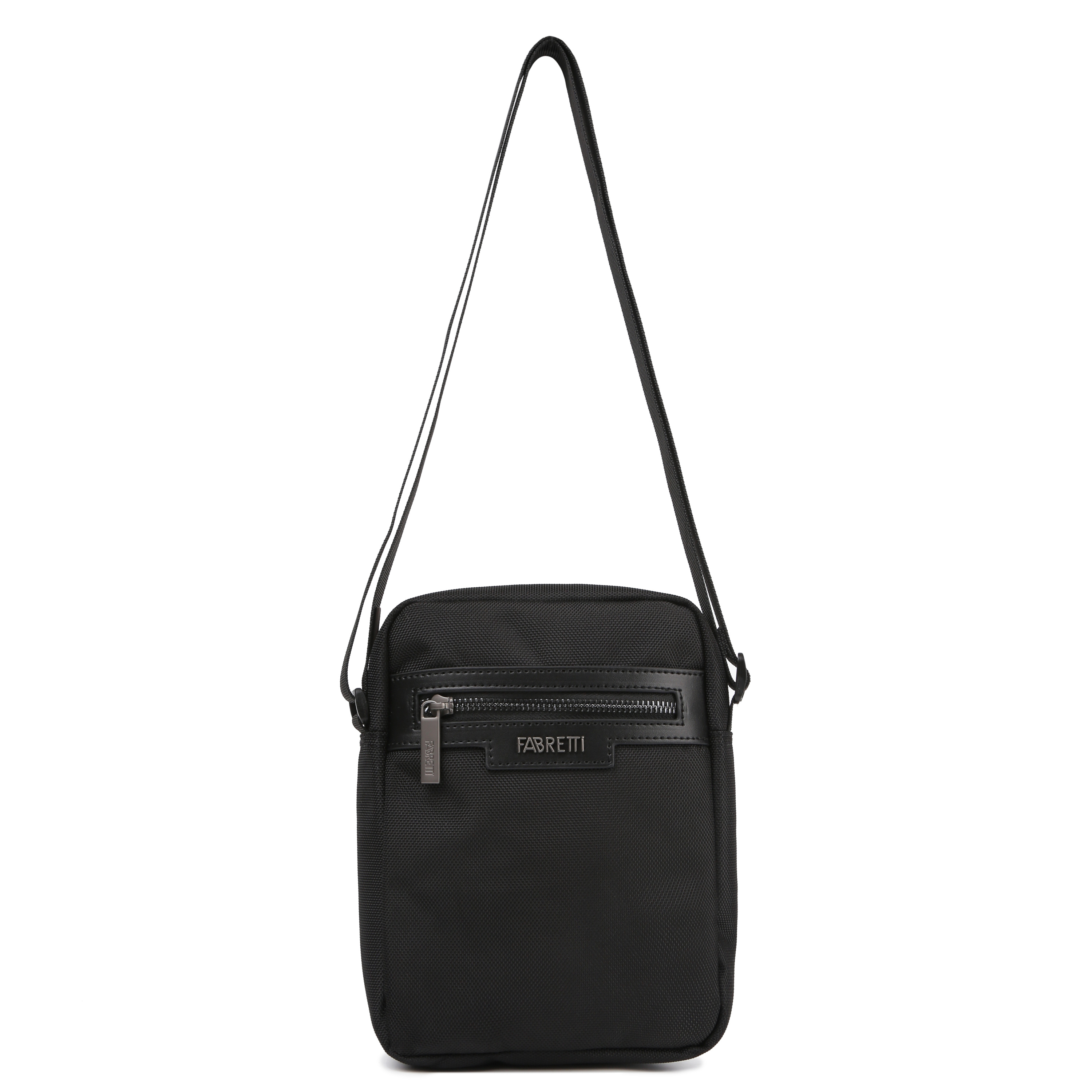 Текстильная сумка FABRETTI в черном цвете выполнена из высокотехнологичного полиэстера. Основное отделение закрывается на полукруглую молнию. Внутри есть открытый карман. На лицевой стороне расположен карман быстрого доступа на молнии. На тыльной стороне есть открытый карман. Плечевой ремень регулируется по длине, ширина - 2,5 см.