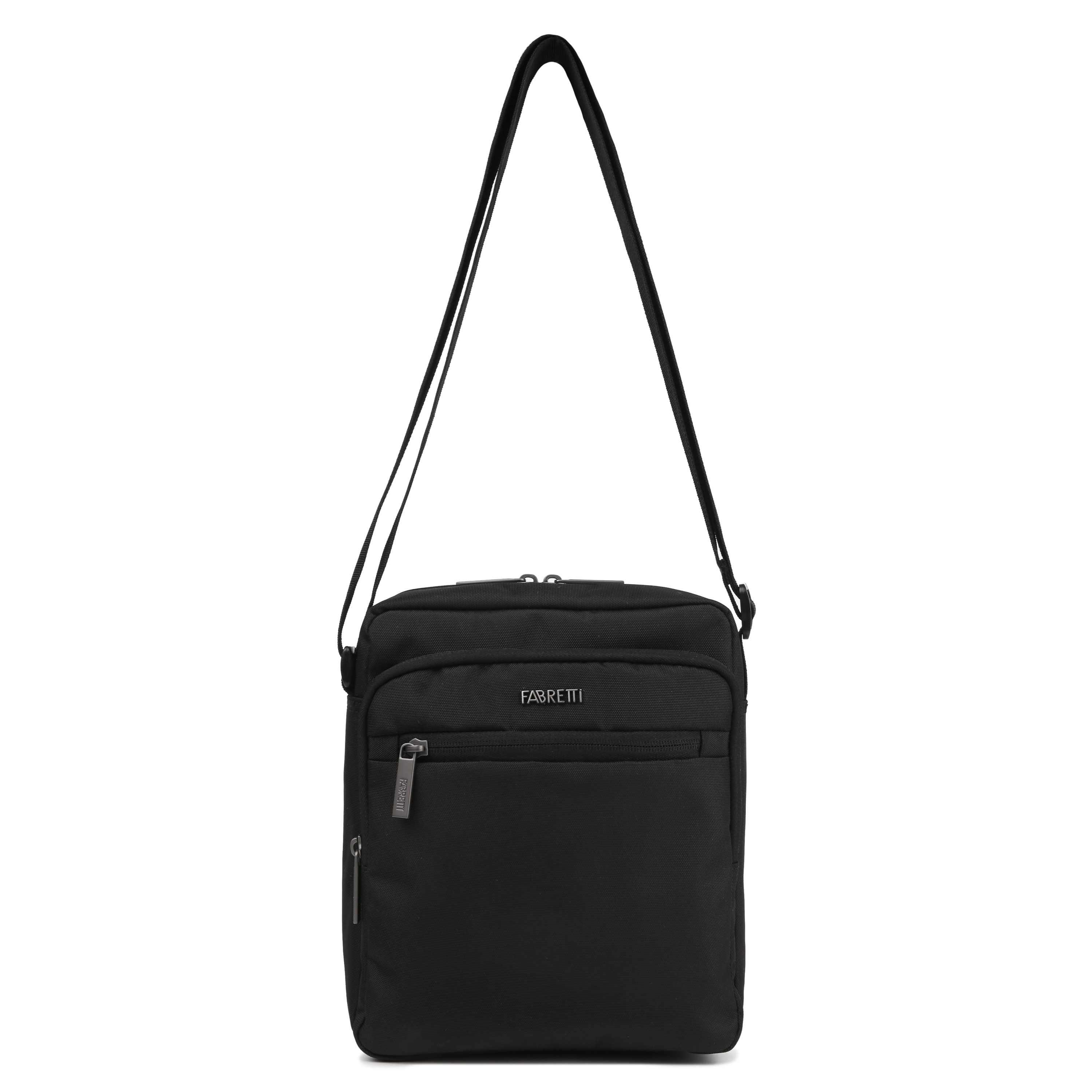Текстильная сумка FABRETTI в черном цвете выполнена из высокотехнологичного полиэстера. Основное отделение закрывается на полукруглую молнию с 2 бегунками. Внутри есть открытый карман. На лицевой стороне расположены 2 кармана быстрого доступа на молнии. На тыльной стороне есть карман на молнии. Плечевой ремень регулируется по длине, ширина - 4 см.
