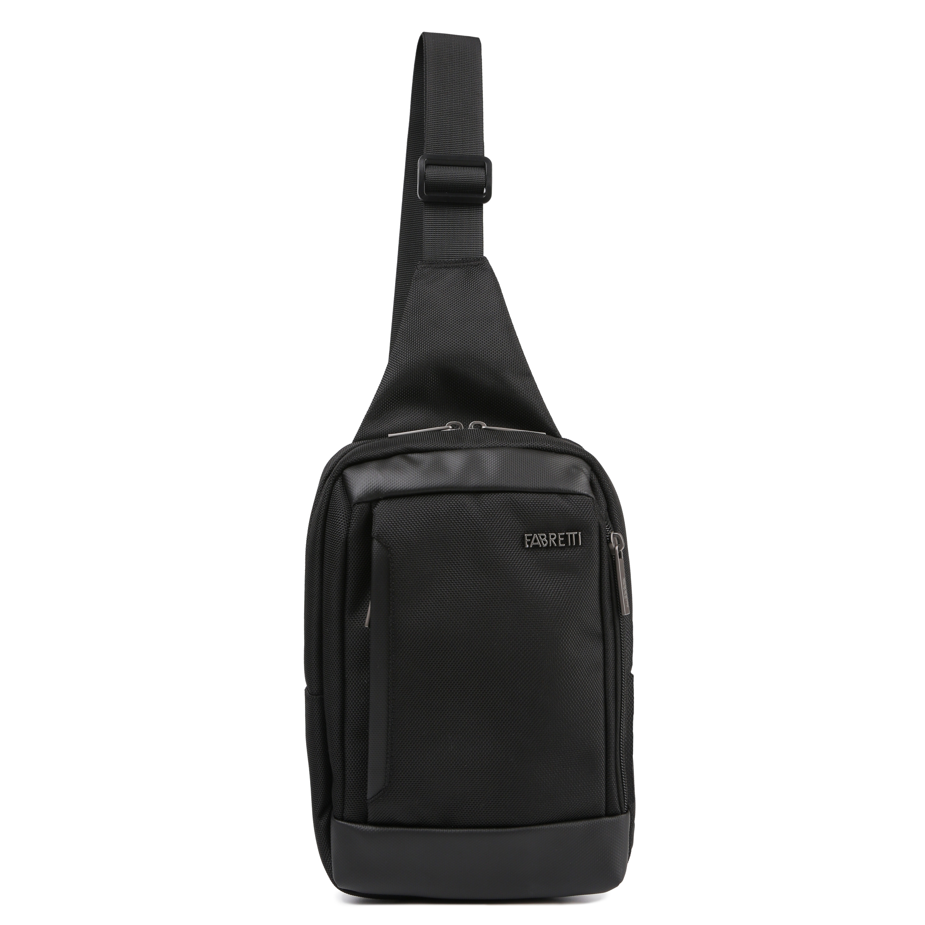 Текстильная сумка FABRETTI в черном цвете выполнена из высокотехнологичного полиэстера. Основное отделение закрывается на полукруглую молнию с 2 бегунками. Внутри есть 5 открытых карманов. На лицевой стороне расположены 2 вертикальных кармана быстрого доступа на молнии. Плечевой ремень регулируется по длине, ширина - 4 см.