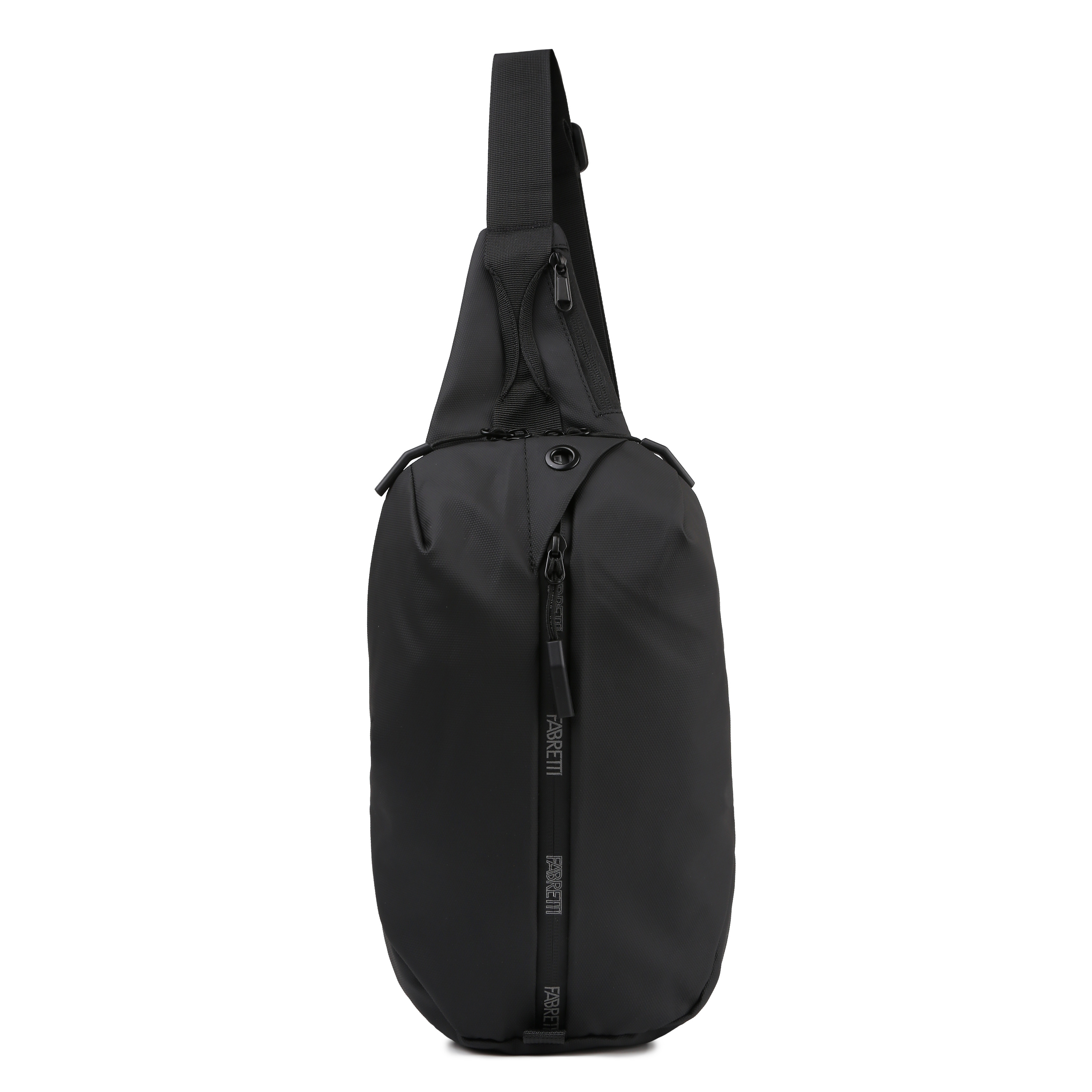 Текстильная сумка FABRETTI в черном цвете выполнена из высокотехнологичного полиэстера. Основное отделение закрывается на полукруглую молнию с 2 бегунками. Внутри есть карман на молнии. На лицевой стороне расположено дополнительное отделение на молнии, внутри которого карман на молнии. На тыльной стороне есть вертикальный карман на молнии, а сверху сумки дополнительный карман для мелочей. Плечевой ремень регулируется по длине, ширина - 4 см.