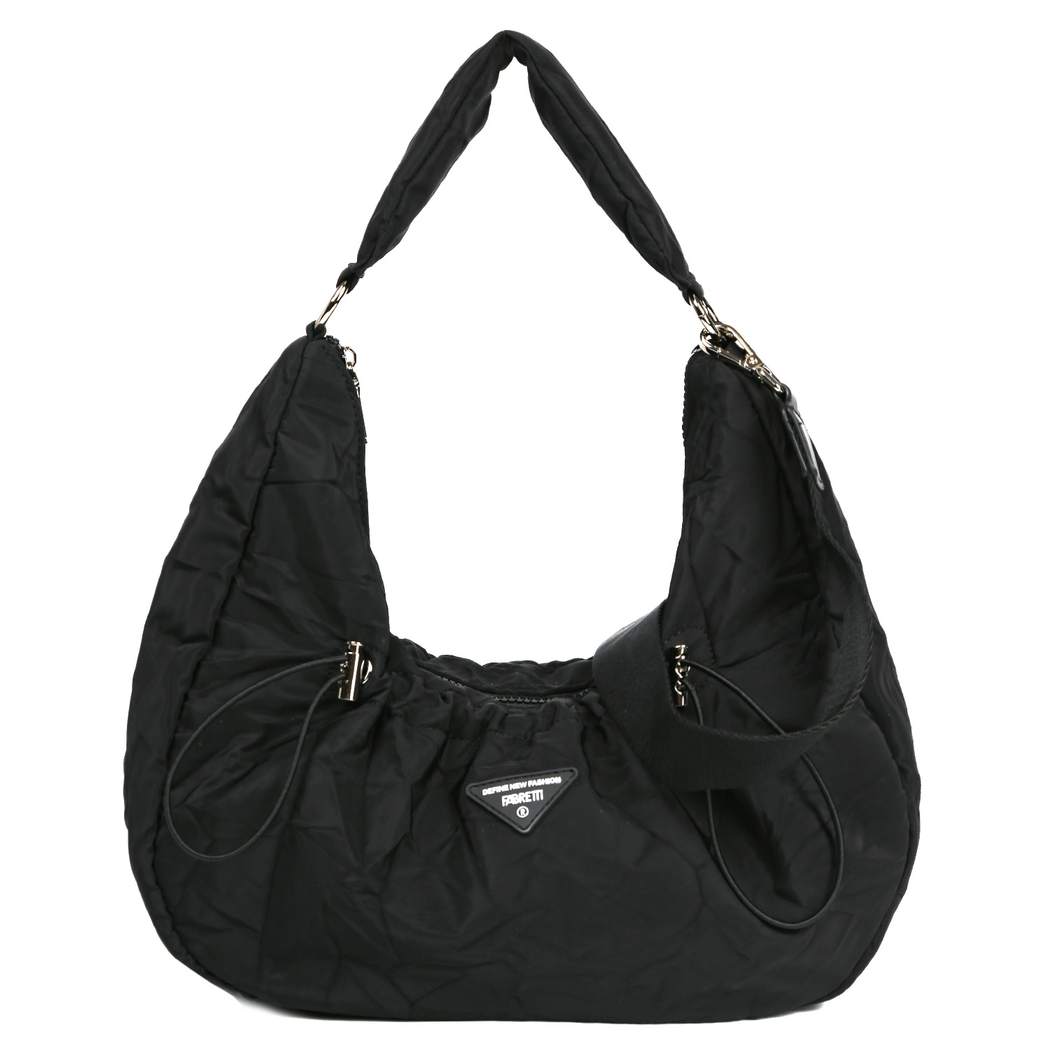 Текстильная сумка на плечо FABRETTI в черном цвете выполнена из высокотехнологичного влагостойкого нейлона жатой фактуры. Он долговечен, практичен и прост в уходе. Основное отделение закрывается на молнию. Внутри 2 кармана для мелочей: открытый и на молнии. На лицевой стороне расположена кулиска, позволяющая регулировать объем изделия и формировать эффектные складки. В комплект входят 2 съемных плечевых ремня: длина первого - 35 см, ширина - 5 см; второй регулируется по длине, ширина - 4 см.