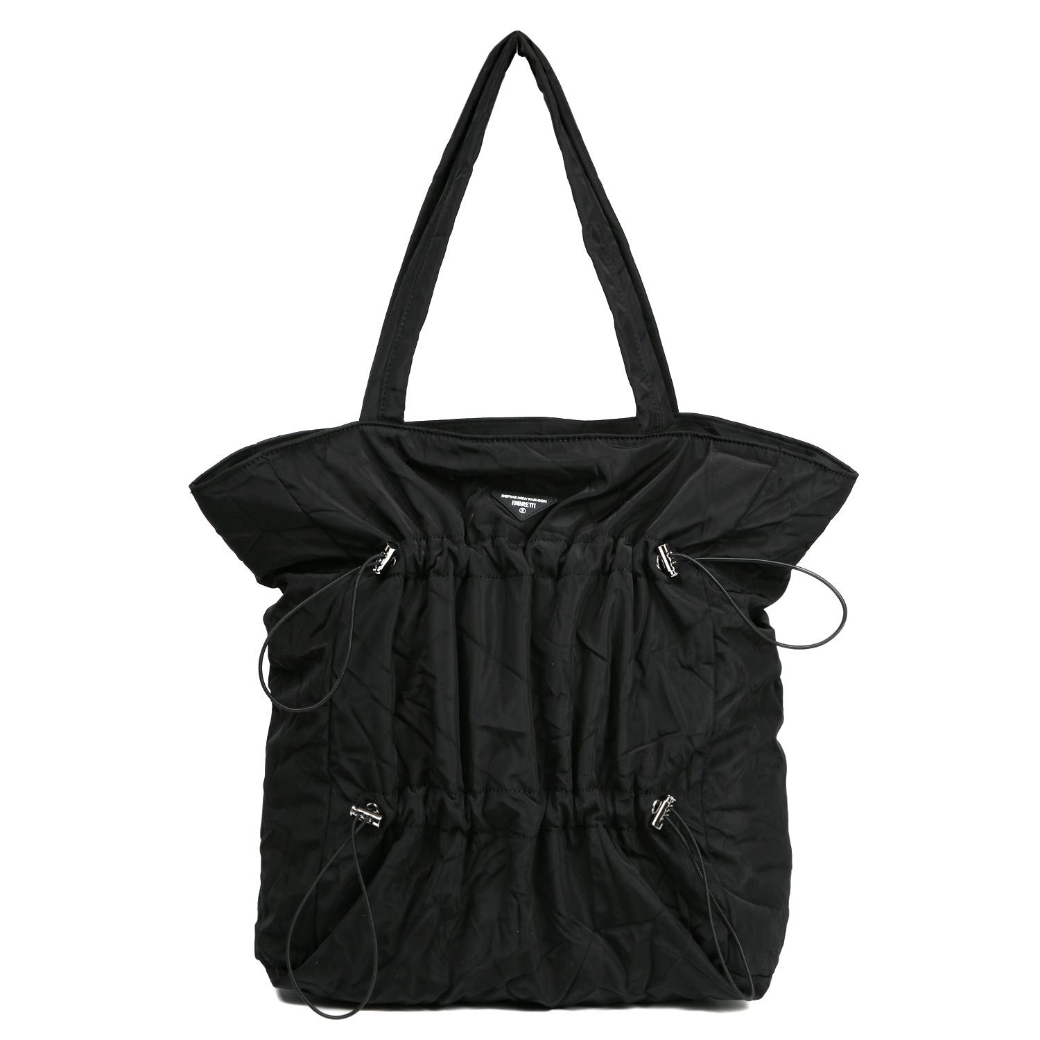 Вместительная сумка на плечо FABRETTI в черном цвете выполнена из высокотехнологичного влагостойкого нейлона жатой фактуры. Он долговечен, практичен и прост в уходе. Основное отделение закрывается на молнию. Внутри 2 кармана для мелочей: открытый и на молнии. Лицевая сторона декорирована 2 кулисками, которые помогают регулировать объем издеалия, а также формируют оригинальные складки. Удлиненные ручки позволяют комфортно носить аксессуар на плече.