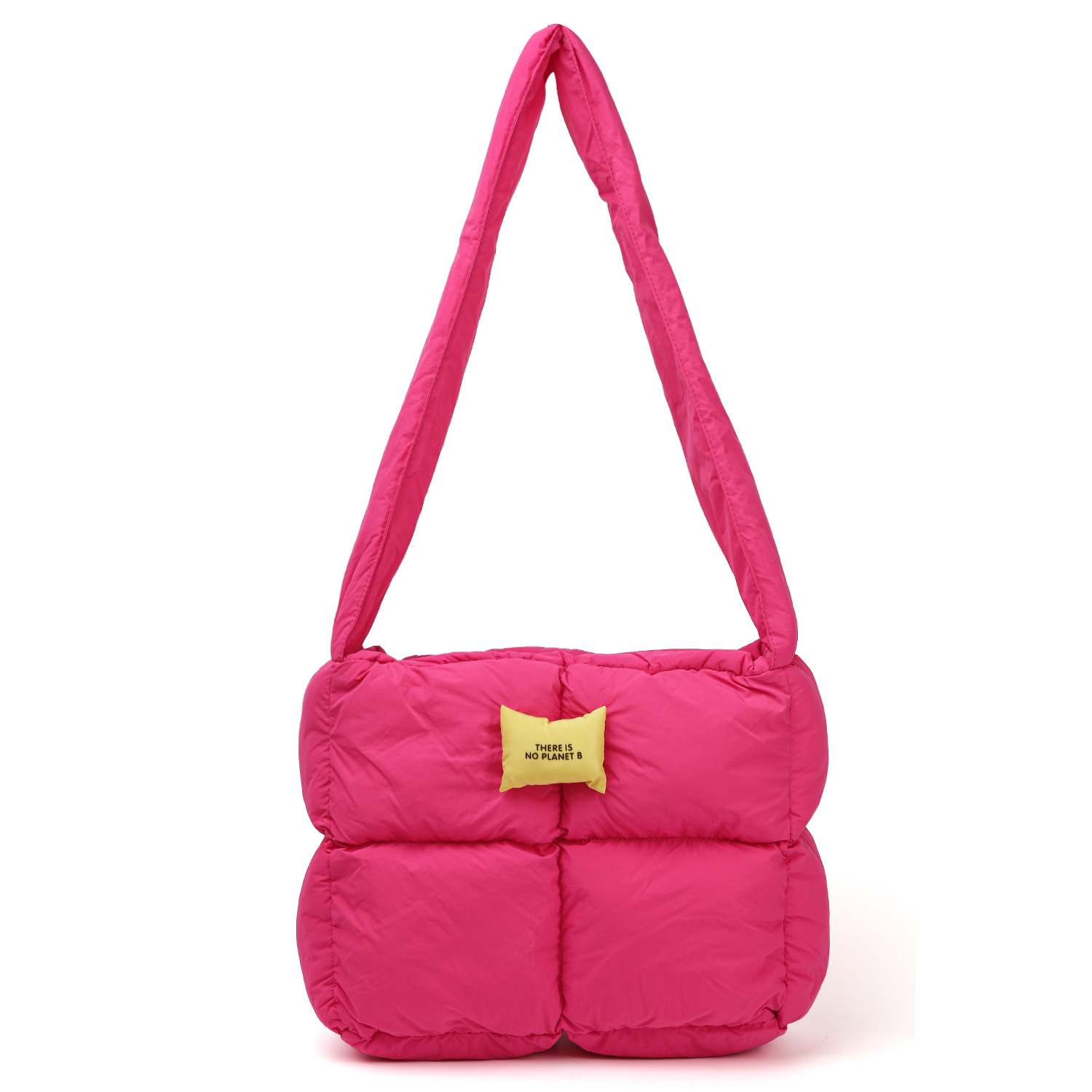 Объемная стеганая сумка на плечо FABRETTI в ярком оттенке фуксии выполнена из высокотехнологичного влагостойкого нейлона. Он практичен и прост в уходе. Основное отделение закрывается на молнию. Внутри 2 боковых кармана: открытый и на молнии. Лицевая сторона декорирована оригинальной деталью в виде мягкой подушки с надписью. Плечевой ремень позволяет комфортно носить изделие на плече, ширина - 10 см.