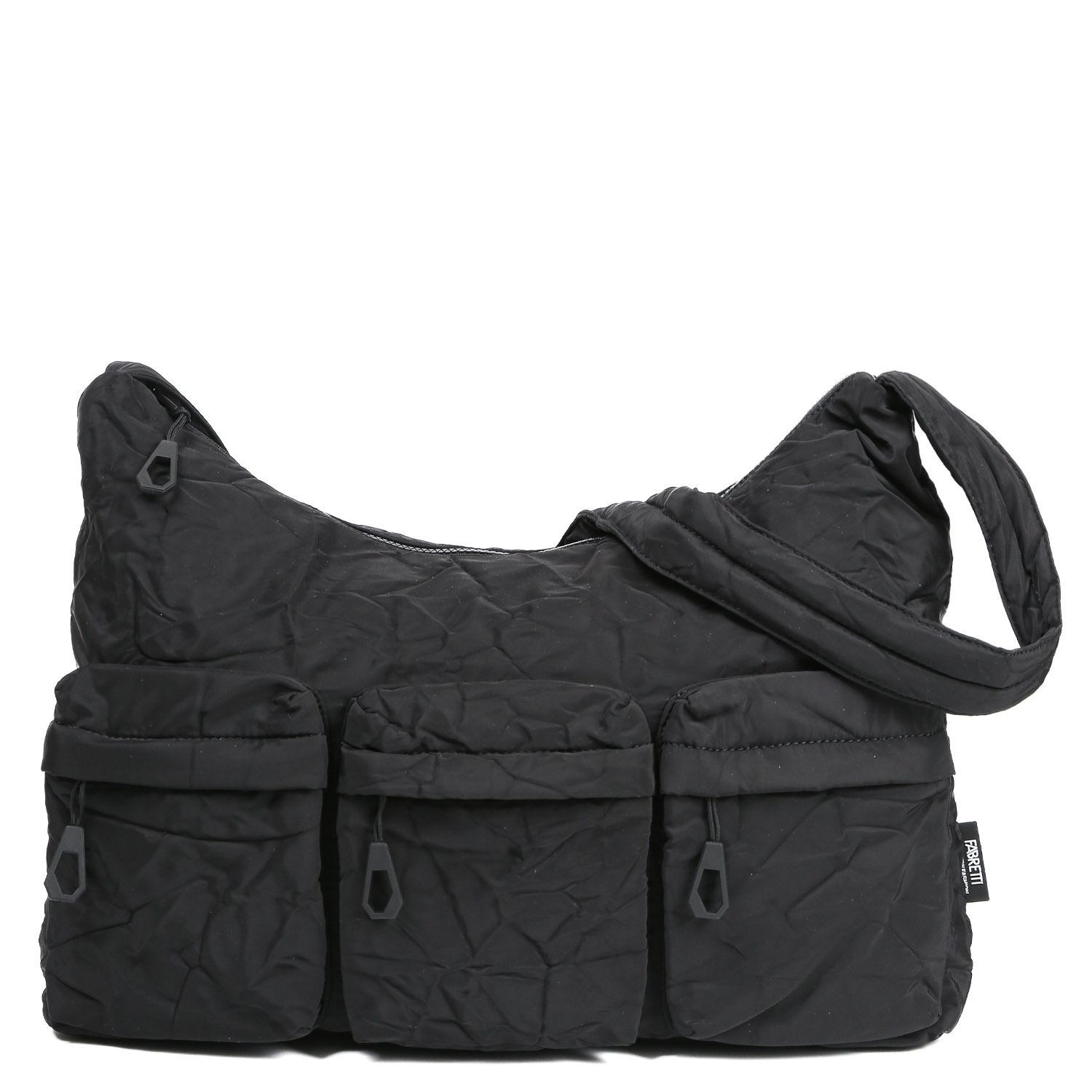 Вместительная текстильная сумка на плечо FABRETTI в черном цвете выполнена из высокотехнологичного влагостойкого нейлона жатой фактуры. Он долговечен, практичен и прост в уходе. Основное отделение закрывается на молнию. Внутри есть карман на молнии для мелочей. На лицевой стороне предусмотрены 3 кармана быстрого доступа на потайной молнии. На тыльной стороне есть карман быстрого доступа на молнии. Плечевой ремень регулируется по длине, ширина - 4 см.