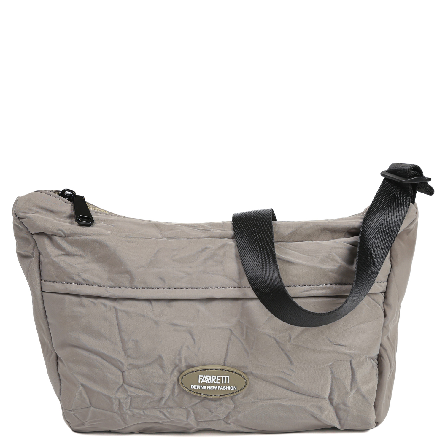Текстильная сумка через плечо FABRETTI в темно-бежевом оттенке выполнена из высокотехнологичного влагостойкого нейлона жатой фактуры. Он долговечен, практичен и прост в уходе. Основное отделение закрывается на молнию. Внутри 2 кармана для мелочей: открытый и на молнии. На тыльной стороне предусмотрен карман быстрого доступа на магнитной кнопке. Плечевой ремень регулируется по длине, ширина - 2,5 см.