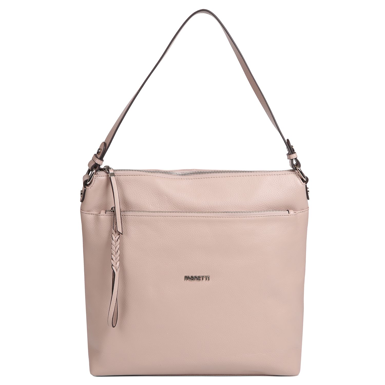 Вместительная сумка-хобо FABRETTI из натуральной зернистой кожи в бежевом цвете многофункциональна и практична. Основное отделение закрывается на молнию с кожаным поводком. Внутри 3 боковых кармана для мелочей: 2 открытых и на молнии. На лицевой стороне предусмотрены 2 вместительных кармана: на магнитной кнопке и на молнии с оригинальным плетеным поводком. На тыльной стороне расположен карман быстрого доступа на молнии. Удобный несъемный ремень позволяет носить изделие на плече или в руке. Фурнитура под серебро гармонично дополняет дизайн изделия. Вместительный размер позволяет носить с собой папки и документы формата А4, а также любимые гаджеты и ежедневники.