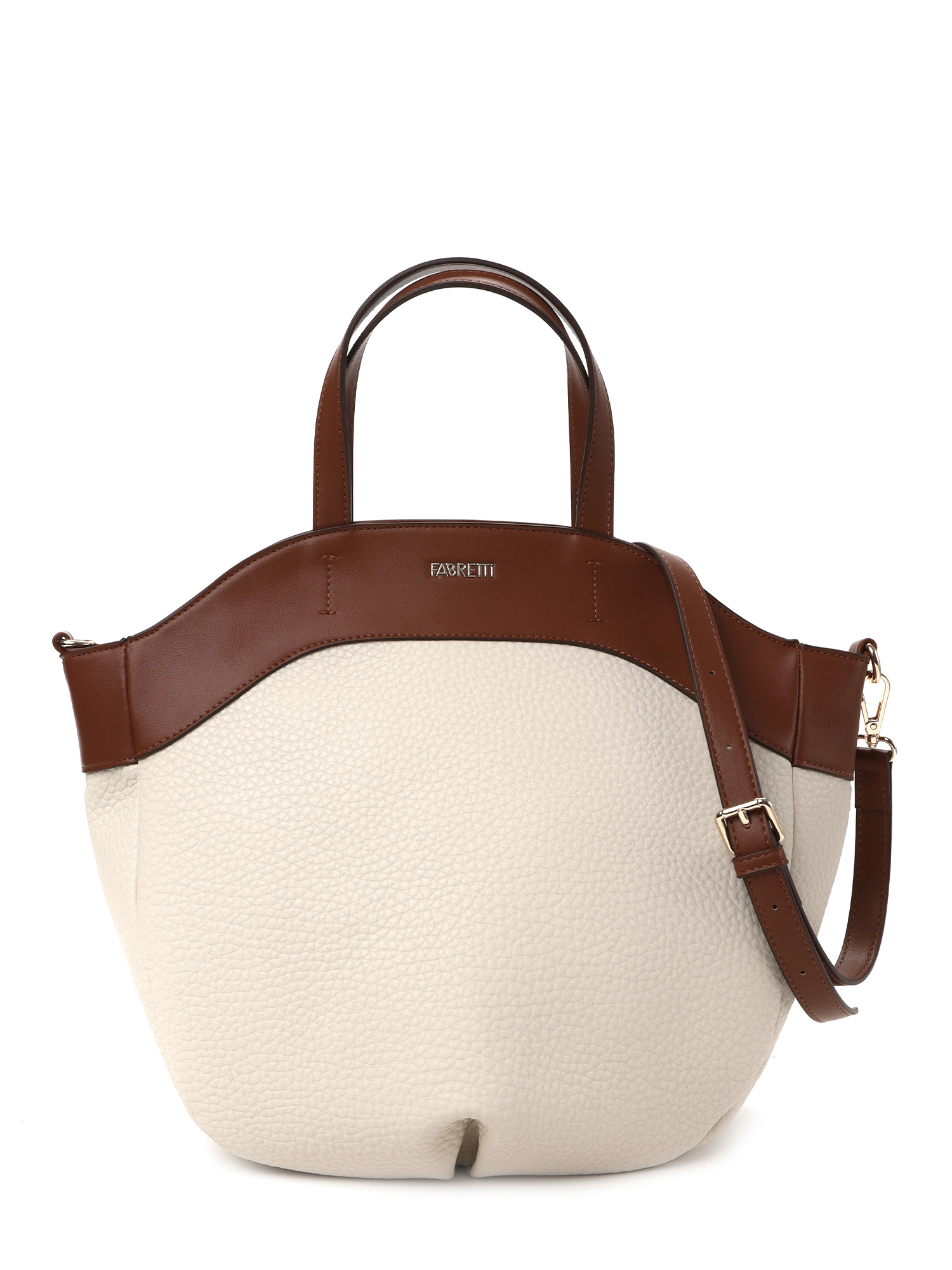 Необычная женская сумка тоут итальянского бренда FABRETTI выполнена из высококачественной экокожи с крупнозернистой фактурой. Модель решена в классической цветовой схеме: светло-бежевая экокожа с рельефом дополнена коричневой отделкой из гладкой экокожи.