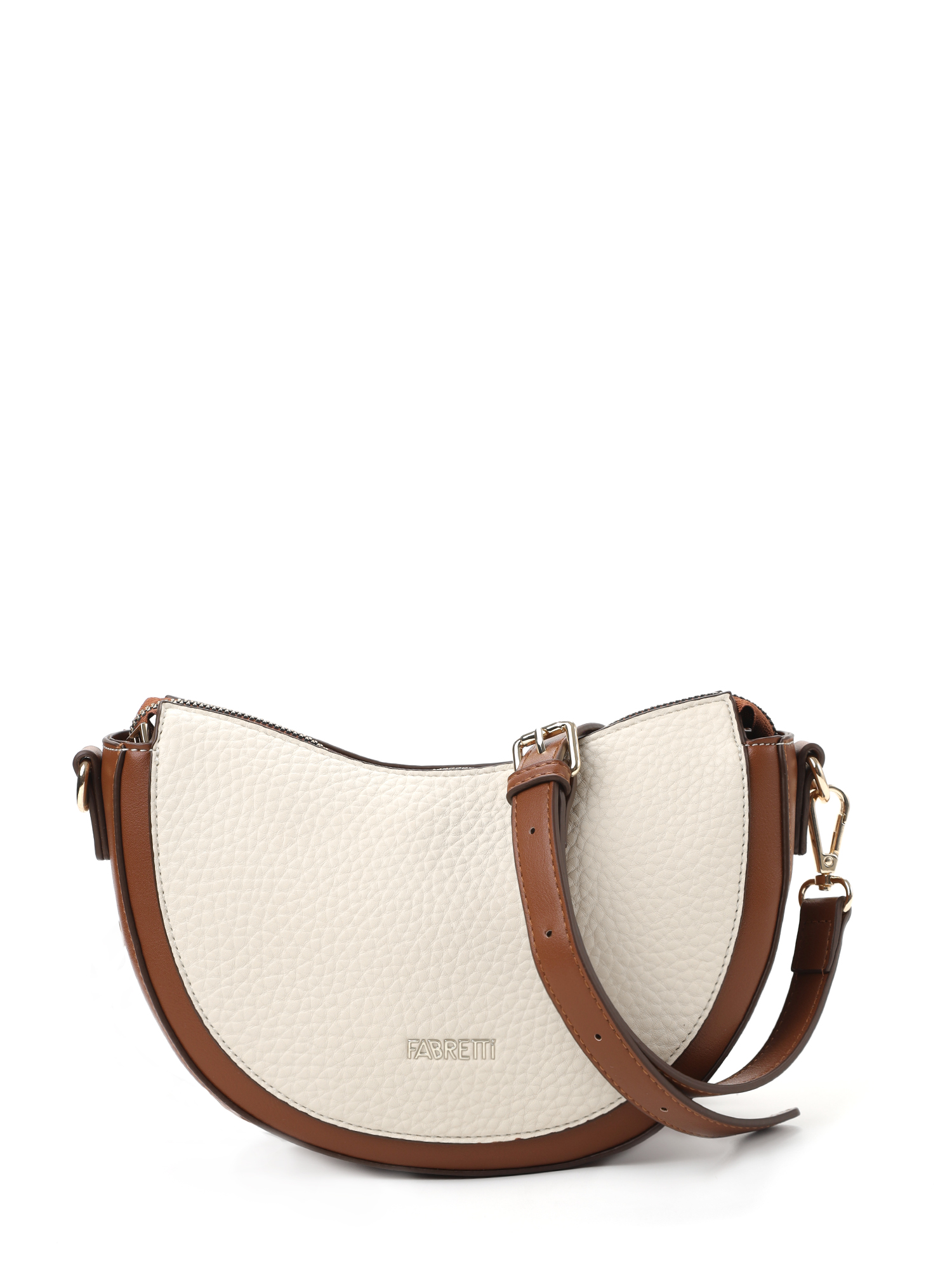 Удобная полукруглая женская сумка кросс-боди итальянского бренда FABRETTI выполнена из высококачественной экокожи с крупнозернистой фактурой. Светло-бежевая рельефная кожа дополнена отделкой из гладкой экокожи коричневого цвета. Это сочетание отлично гармонирует с повседневной одеждой на теплый сезон.