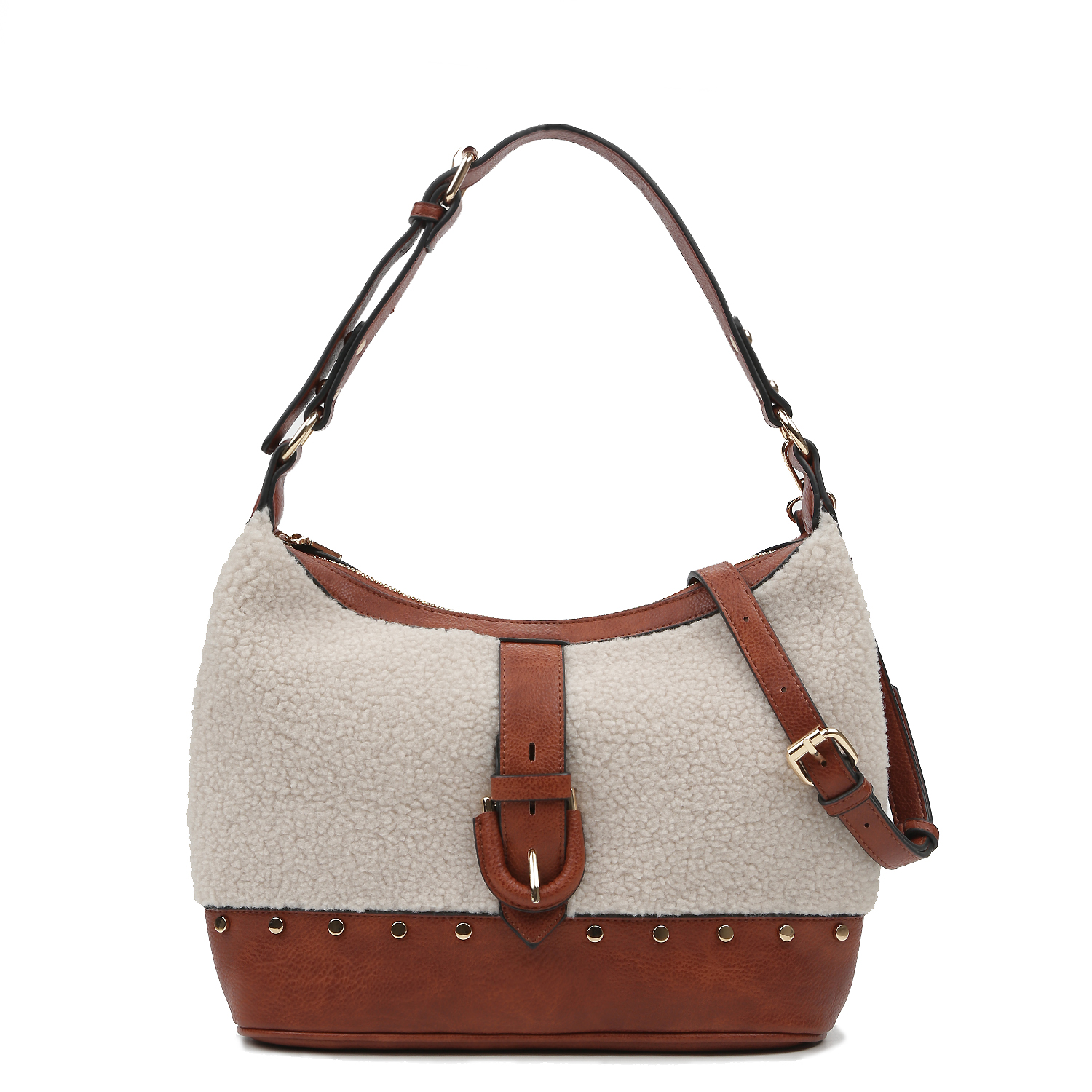 Сумка хобо среднего размера итальянского бренда FABRETTI выполнена из мелкозернистой экокожи бежевого оттенка и декорирована искусственным мехом, имитирующим дублёный. Основное отделение закрывается на молнию. Внутри — два открытых кармана и один карман на молнии. На тыльной стороне расположен внешний карман на молнии для быстрого доступа. Сумку можно носить на регулируемой ручке длиной 51–62 см или на съёмном ремешке длиной 112–131 см и шириной 1,7 см. Цвет фурнитуры — золото.