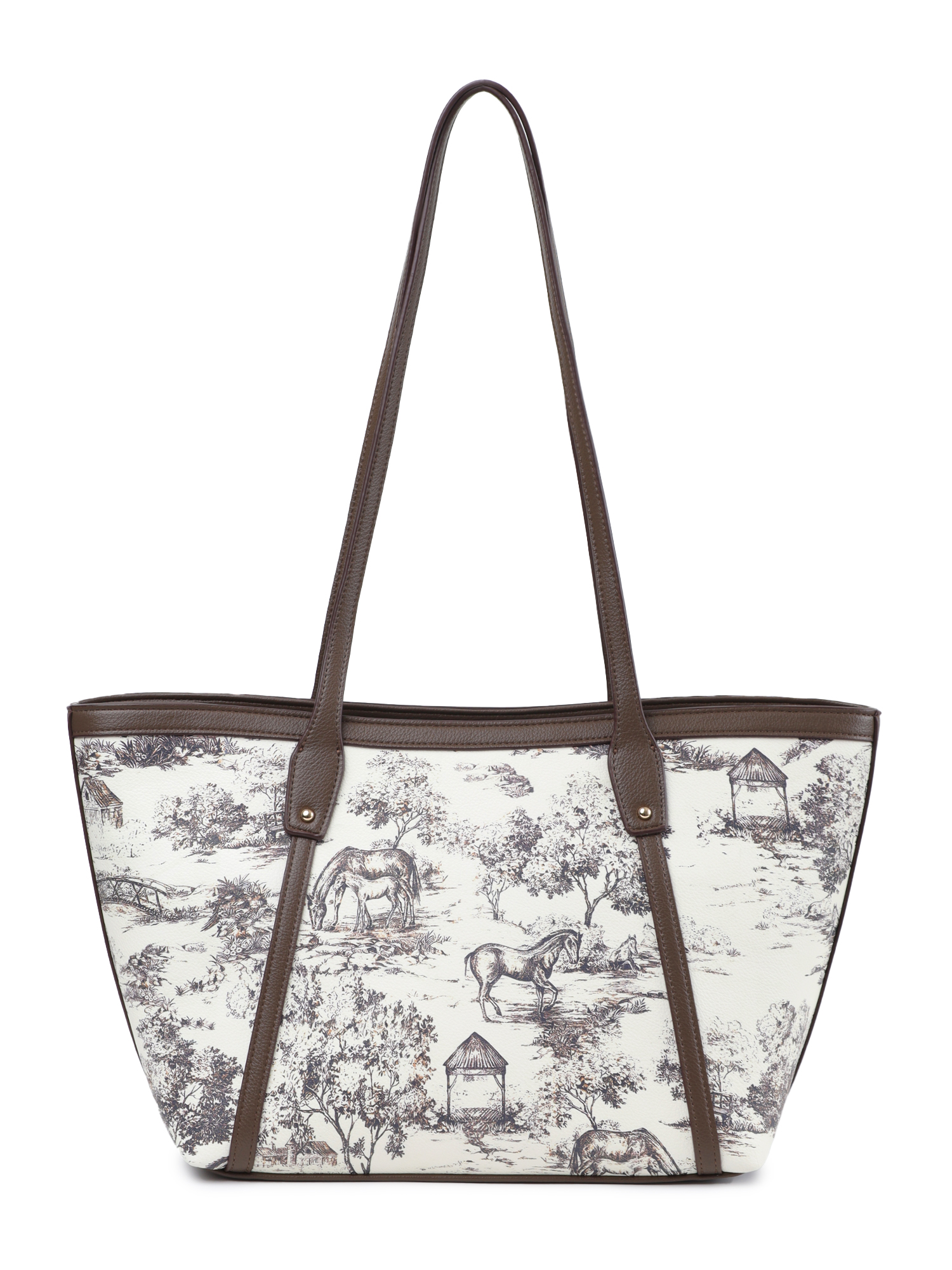 Вместительная городская сумка тоут из коллекции итальянского бренда FABRETTI из белой экокожи с пейзажным принтом и отделкой из гладкой темно-коричневой экокожи. Вместительный вариант для повседневного гардероба, который прекрасно подойдет под одежду природных тонов.