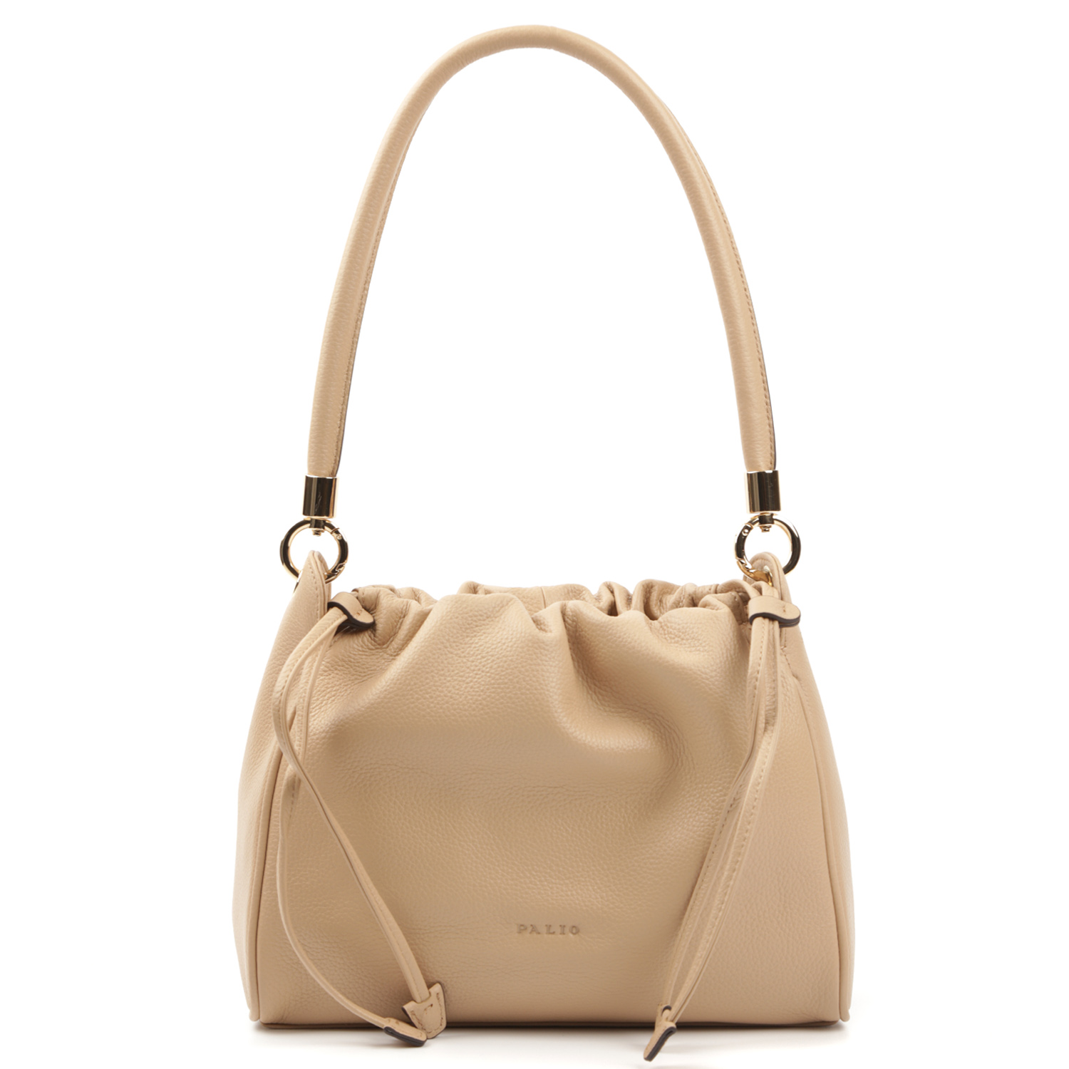Стильная сумка на плечо PALIO в бежевом оттенке выполнена из натуральной зернистой кожи. Сумка отличается лаконичным дизайном и оригинальной формой кисет. Основное отделение закрывается на стягивающийся кожаный шнур и на магнитную кнопку. Внутри 3 боковых кармана для мелочей: 2 открытых и на молнии. Съемный плечевой ремень (ширина - 1,5 см) гармонично дополняет дизайн изделия. Цвет фурнитуры - золото.