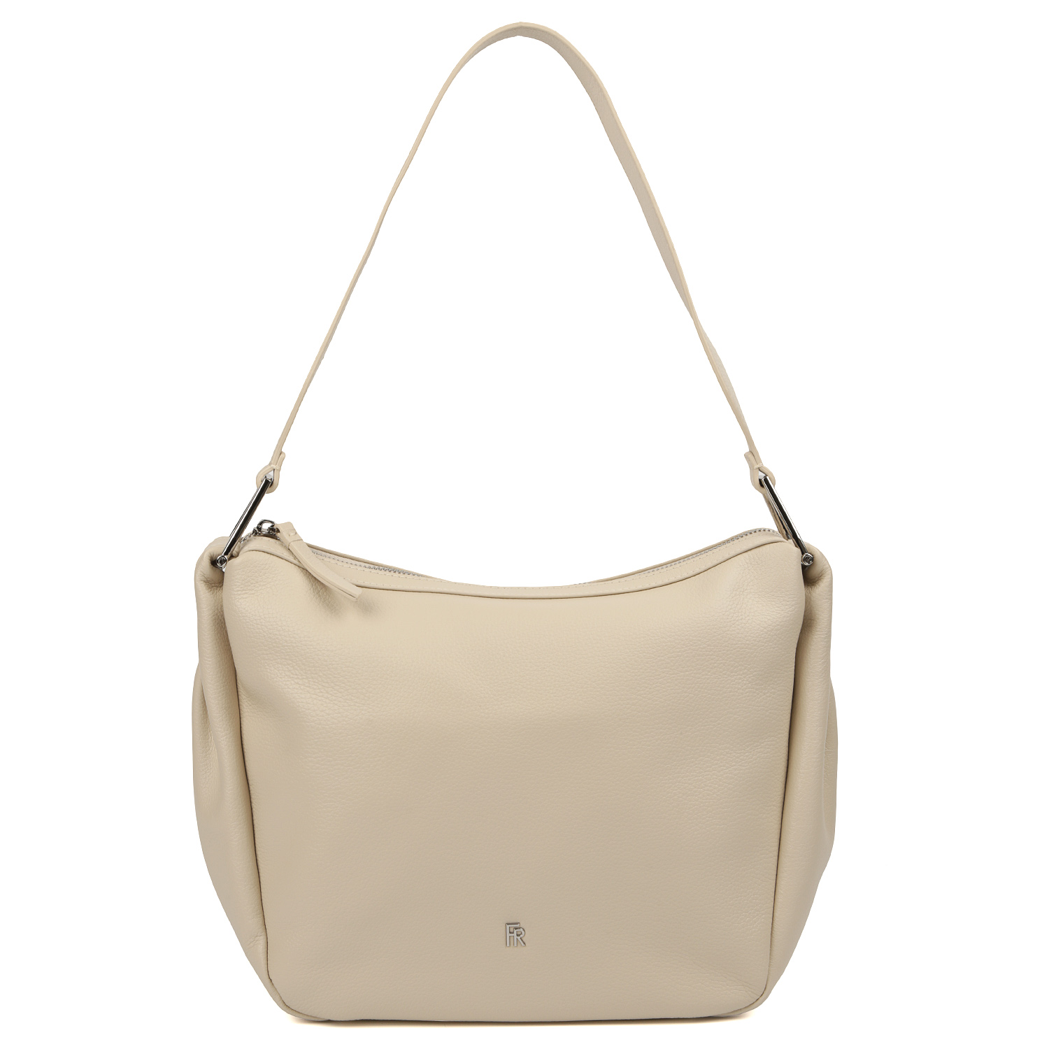 Стильная сумка-хобо FABRETTI в светло-бежевом оттенке выполнена из натуральной зернистой кожи. Основное отделение закрывается на молнию. Внутри 3 боковых кармана для мелочей: 2 открытых и на молнии. На тыльной стороне – карман быстрого доступа на молнии. Плечевой ремень позволяет комфортно носить аксессуар на плече или в руке, ширина - 3,5 см. Цвет фурнитуры - серебро.