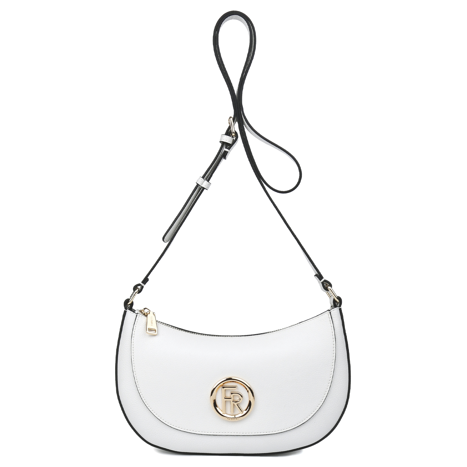 Компактная сумка кросс-боди FABRETTI в белом цвете выполнена из натуральной высококачественной зернистой кожи, приятной на ощупь. Основное отделение закрывается на молнию с металлическим поводком. Внутри 2 кармана для мелочей: открытый и на молнии. На тыльной стороне предусмотрен карман быстрого доступа. Лицевая сторона декорирована фурнитурой с монограммой бренда. Плечевой ремень регулируется по длине, ширина - 1,5 см. Цвет фурнитуры - золото.