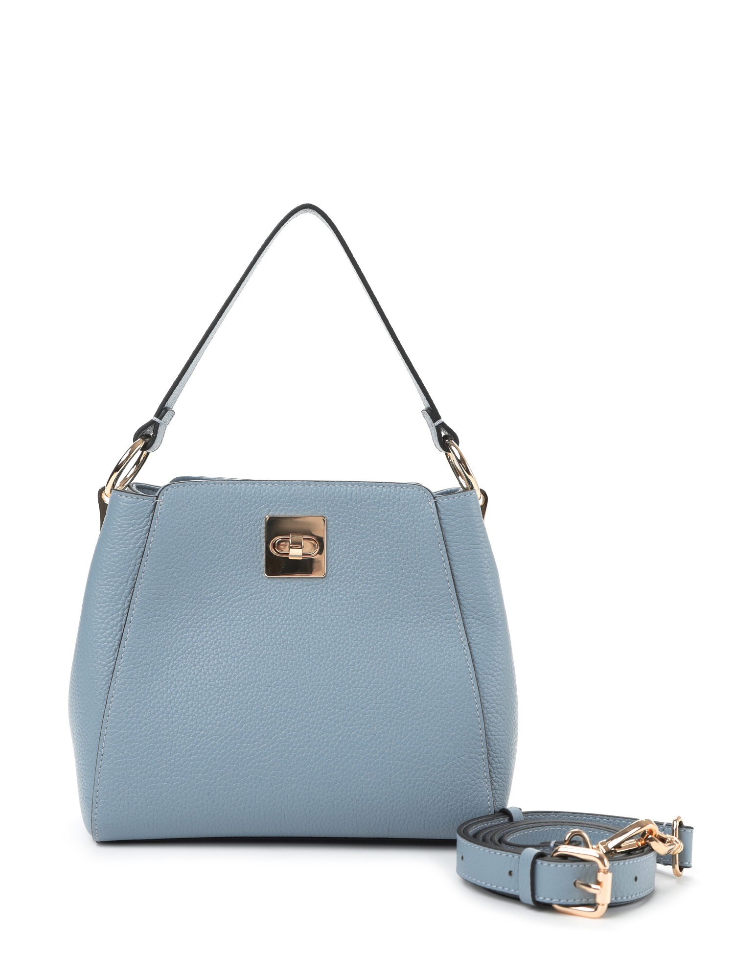 Модель выполнена из высококачественной плотной кожи с зернистой фактурой, холодный светло-голубой цвет контрастирует с черной окантовкой краев.