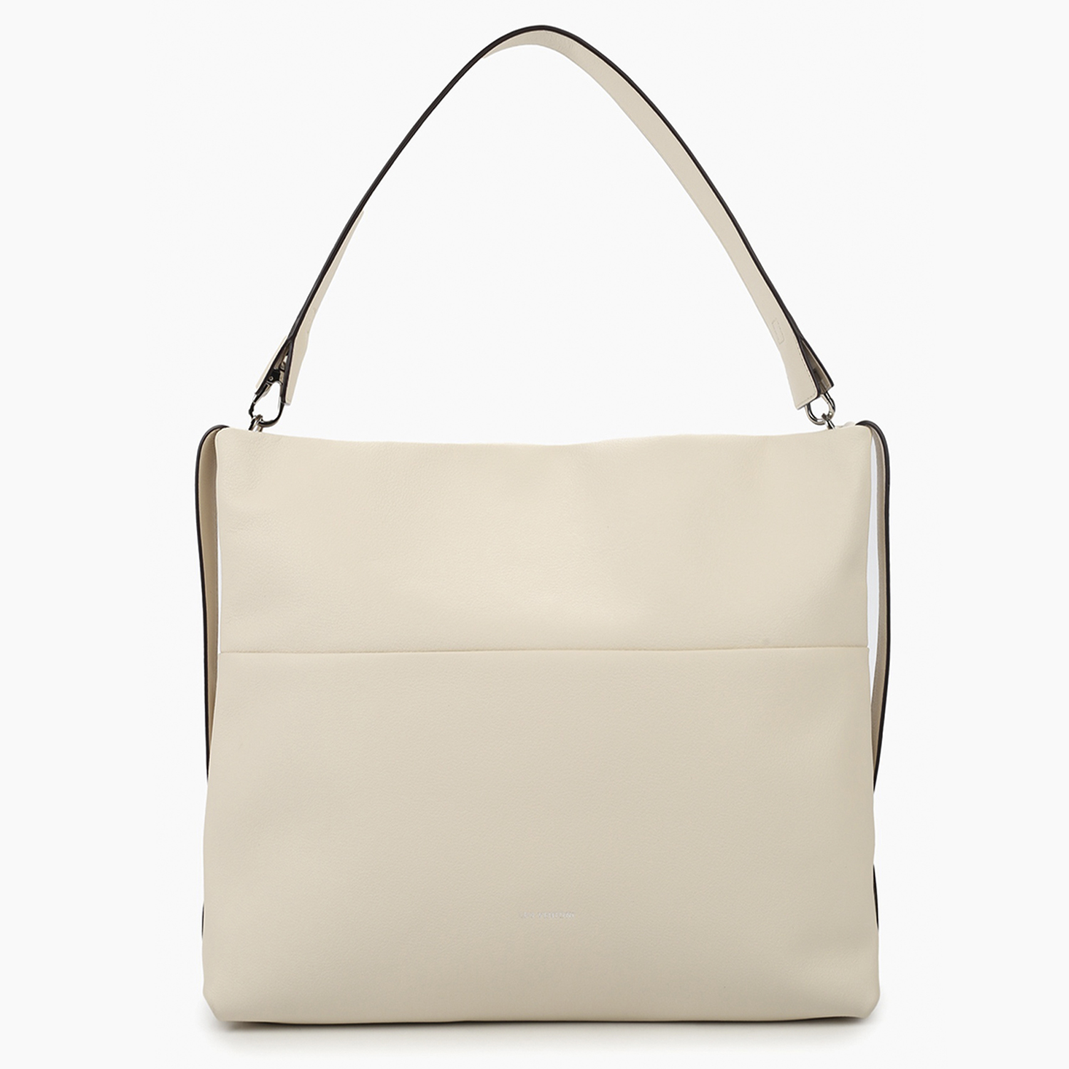 Большая сумка-хобо LEO VENTONI в светло-бежевом цвете выполнена из натуральной зернистой кожи. Сумка закрывается на молнию с удлиненным кожаным поводком. Внутри 2 отдела, разделенные карманом на молнии, и 2 кармана для мелочей: открытый и на молнии. Подкладка - из натурального хлопка. На тыльной стороне предусмотрен карман быстрого доступа на молнии. В комплекте 2 съемных плечевых ремня: длина одного - 55 см, ширина - 3 см; второй ремень текстильный, регулируется по длине, ширина - 3,5 см. Цвет фурнитуры - серебро.