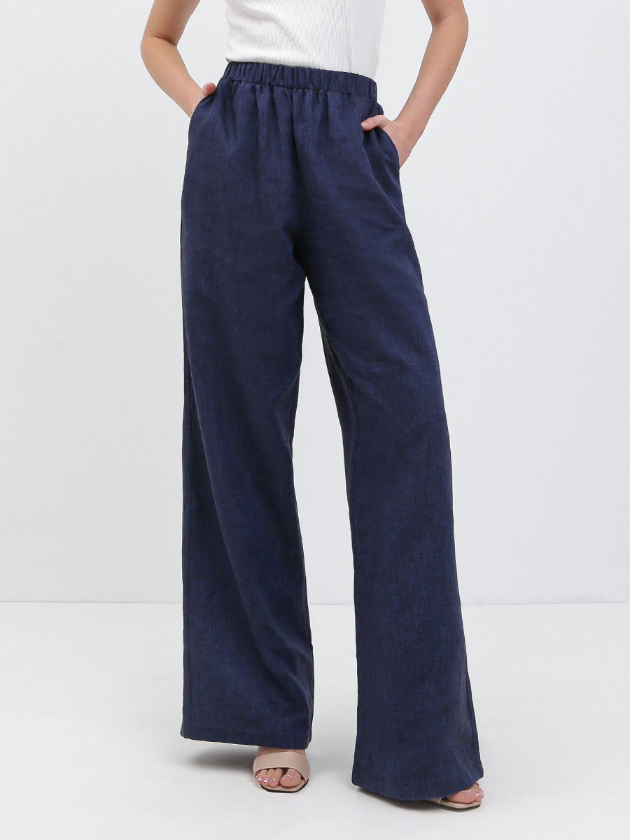 Льняные женские брюки итальянского бренда FABRETTI в темно-синем цвете. Классическая модель свободных прямых брюк с широкой резинкой в поясе. По бокам втачные карманы.