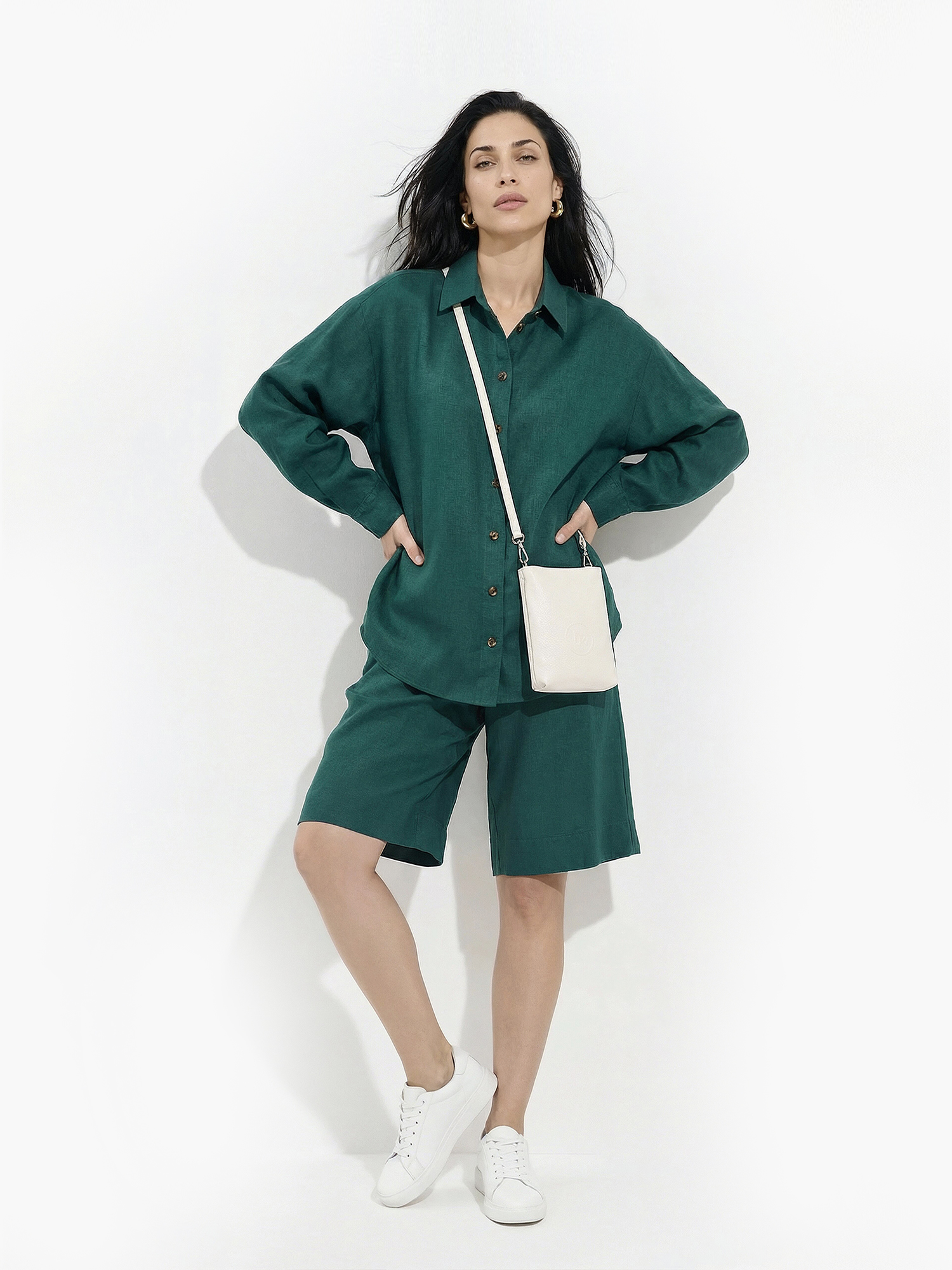 Легкая льняная ткань имеет классическую узловатую фактуру. Низ имеет широкую подгибку - можно создать стильный отворот и уменьшить длину шорт, визуально удлиннив ноги.