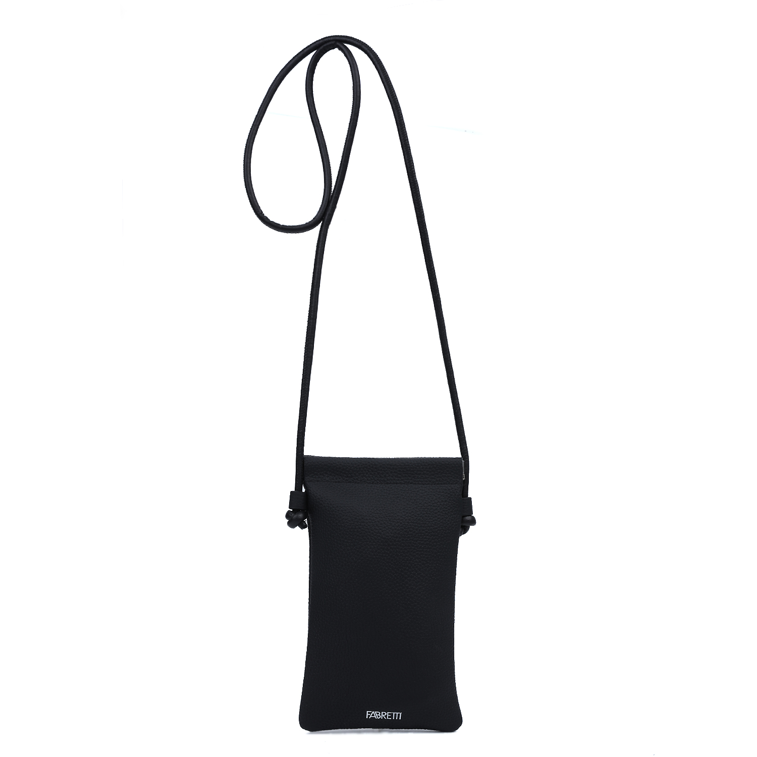 Необычная вертикальная женская сумка для телефона через плечо итальянского бренда FABRETTI выполнена из мягкой натуральной кожи черного цвета с крупнозернистой фактурой. Основное отделение закрывается на гибкий замок-рамку.