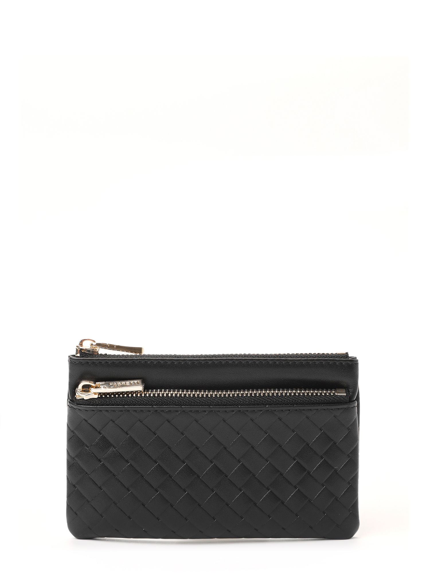 Основное отделение застегивается на молнию, внутри оно дополнено металлическим кольцом для ключей на цепочке и тремя слотами для карт. Второе отделение на лицевой стороне застегивается на молнию. Цвет фурнитуры – золото.