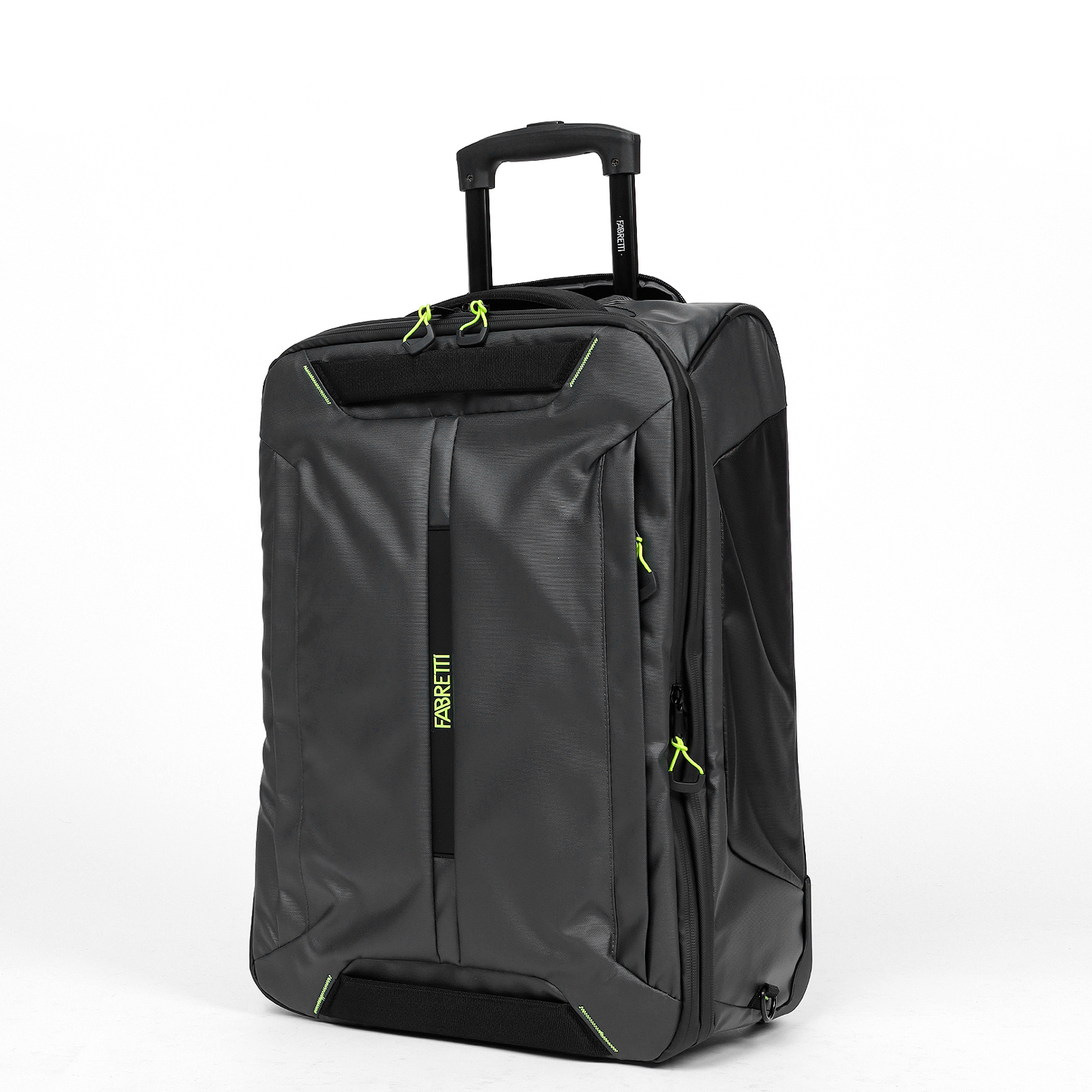 Серый текстильный чемодан-"трансформер" FABRETTI может выполнять функцию рюкзака или чемодана.
