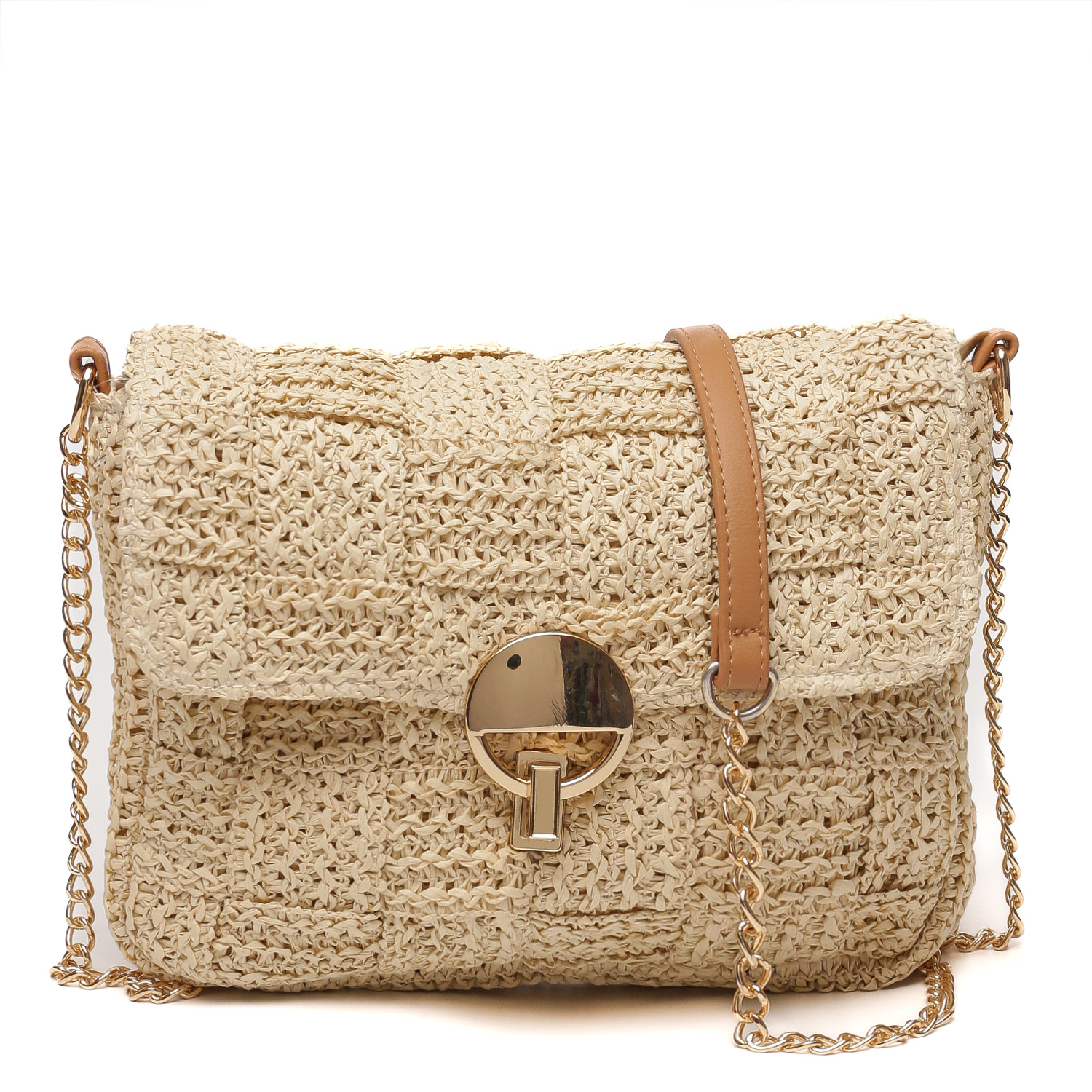 Верх сумки выполнен шахматным плетением. Сумка дополнена ремешком-цепочкой с вставкой из экокожи на плече.