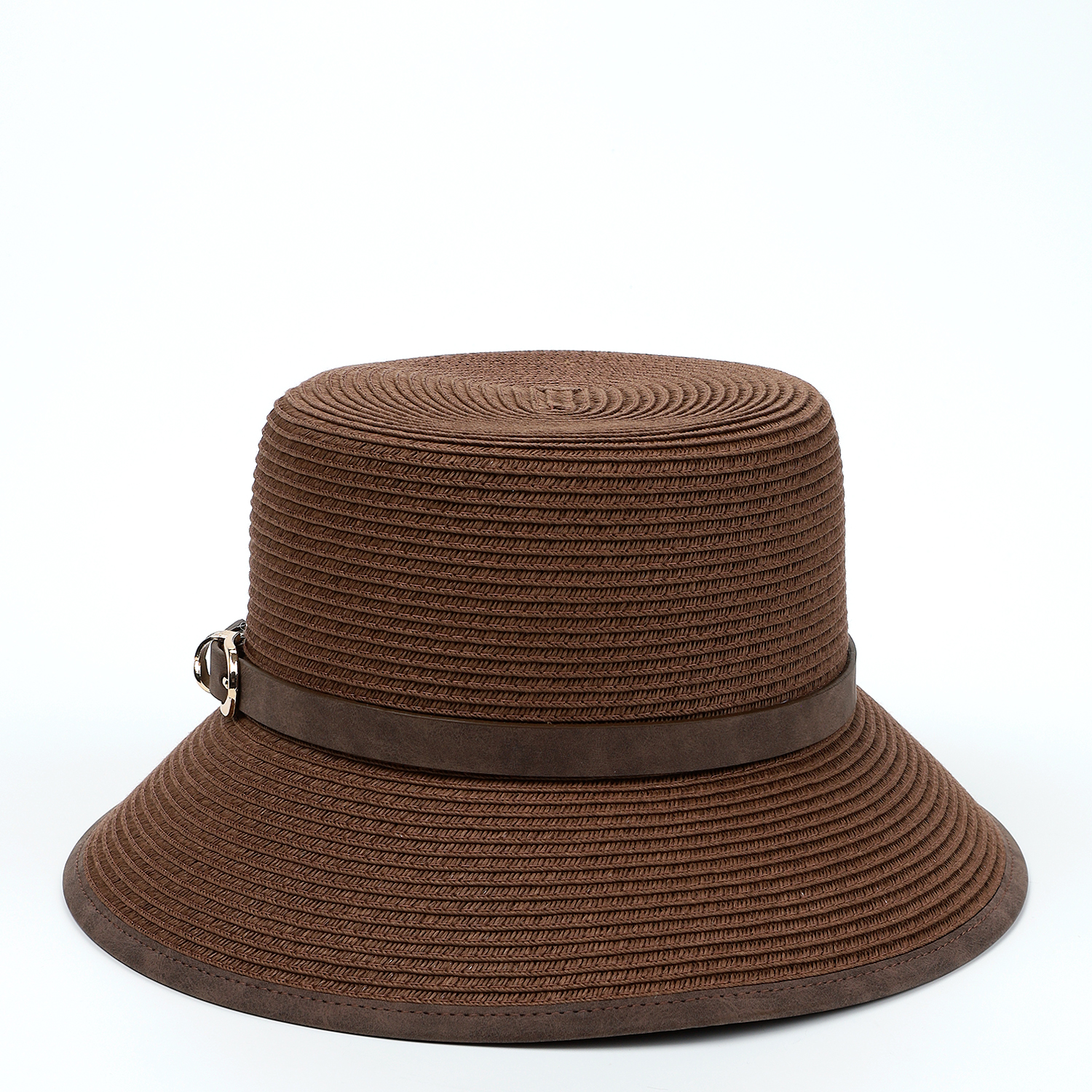 Шляпа-абажур - классическая летняя модель с опущенными полями - защищает от солнца и придает образу романтичную загадочность. Шляпка выполнена в коричневом цвете и украшена ремешком из экозамши с пряжкой на тулье. По краю полей идет замшевая окантовка. Внутри размер регулируется лентой.