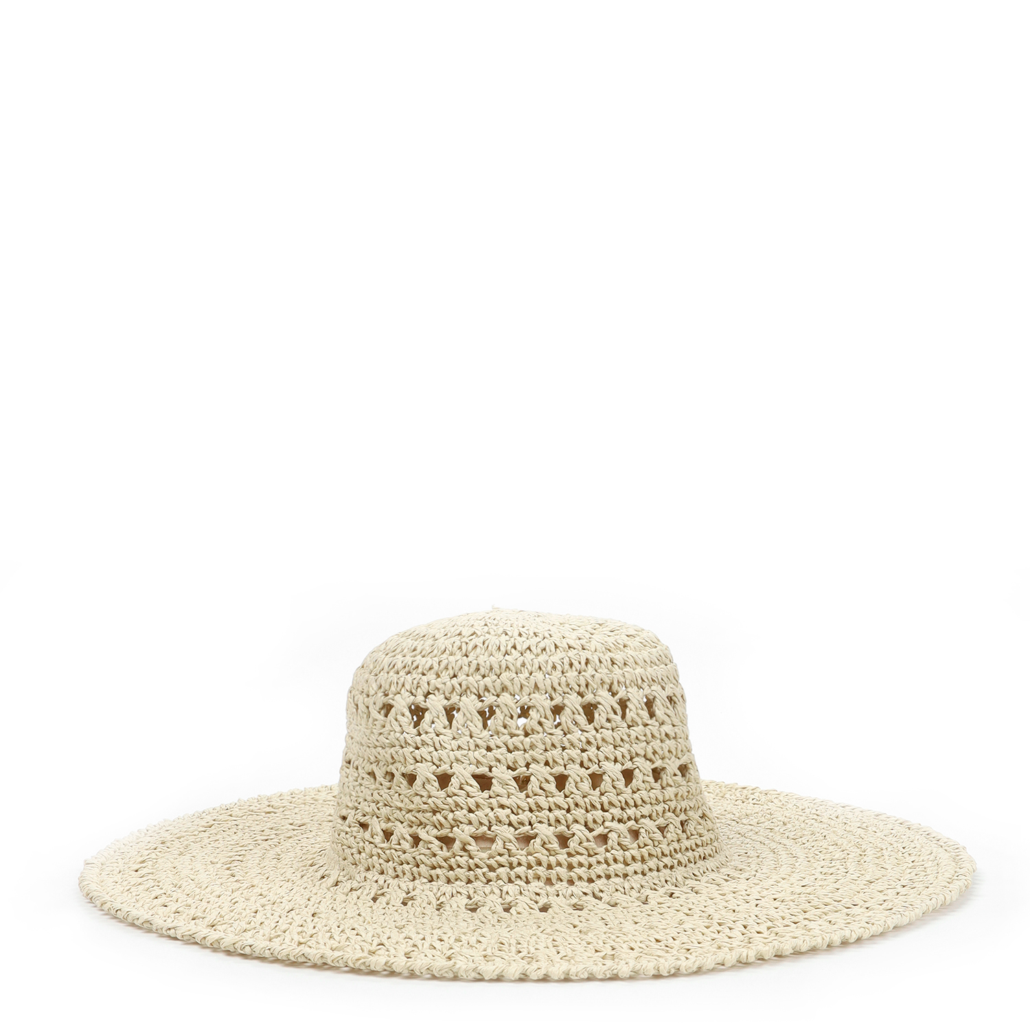 Летняя широкополая женская шляпа итальянского бренда FABRETTI выполнена в стиле «кроше», имитирующем вязаные узоры, в молочном цвете.