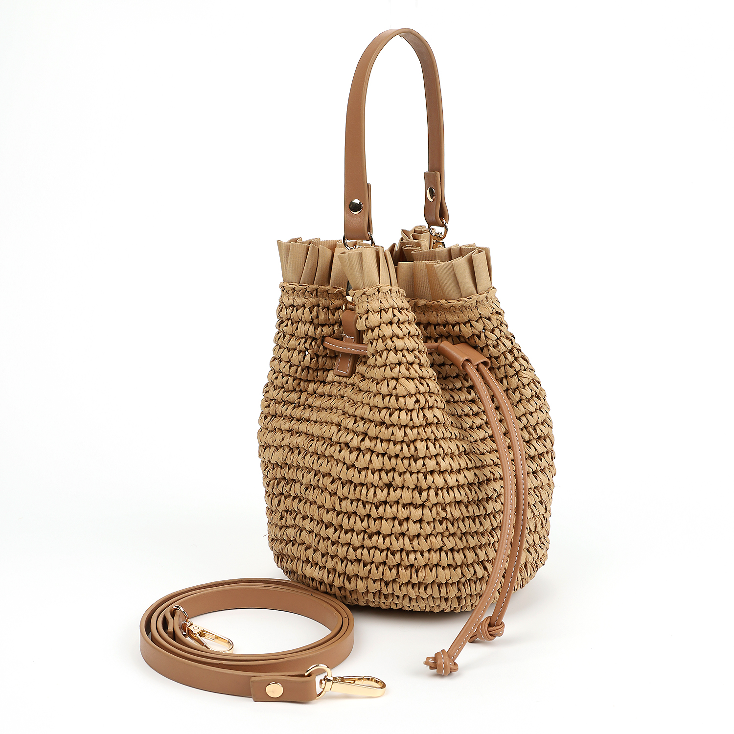 У модели интересный декор – основа из плетеной соломки из целлюлозы дополнена по верху текстильными складками, дополняют оформление ремешки из экокожи с блестящей фурнитурой.